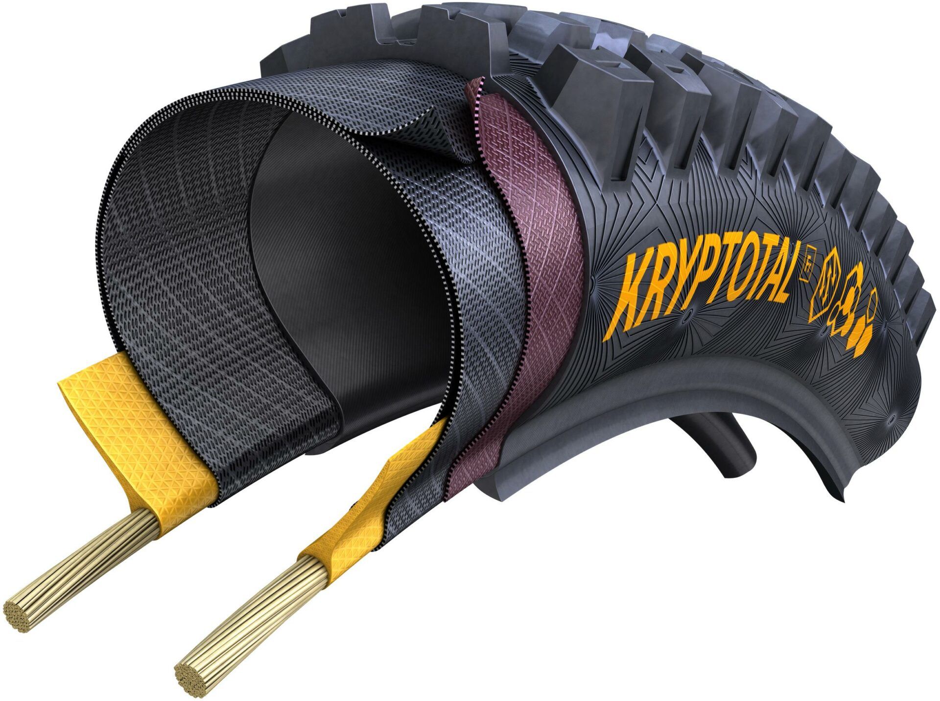 Pattern design especially tailored for front wheel use. Benefit: best performance in front wheel specific requirements like track stability, agility. Designed with the same design boundary conditions as KRYPTOTAL Re: steep and shallow ramps tailored to the area of application in mixed and loose terrain. Benefit: balance between harmonious, easy rolling and power transmission