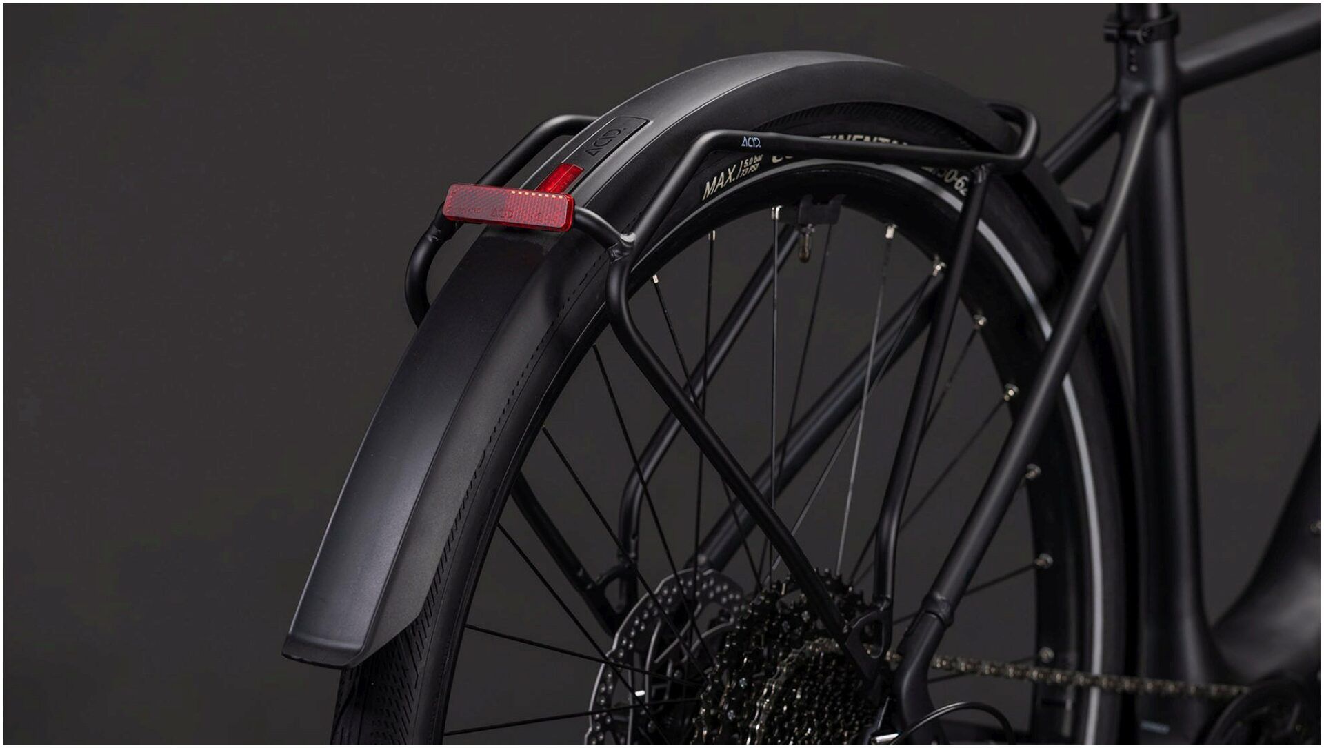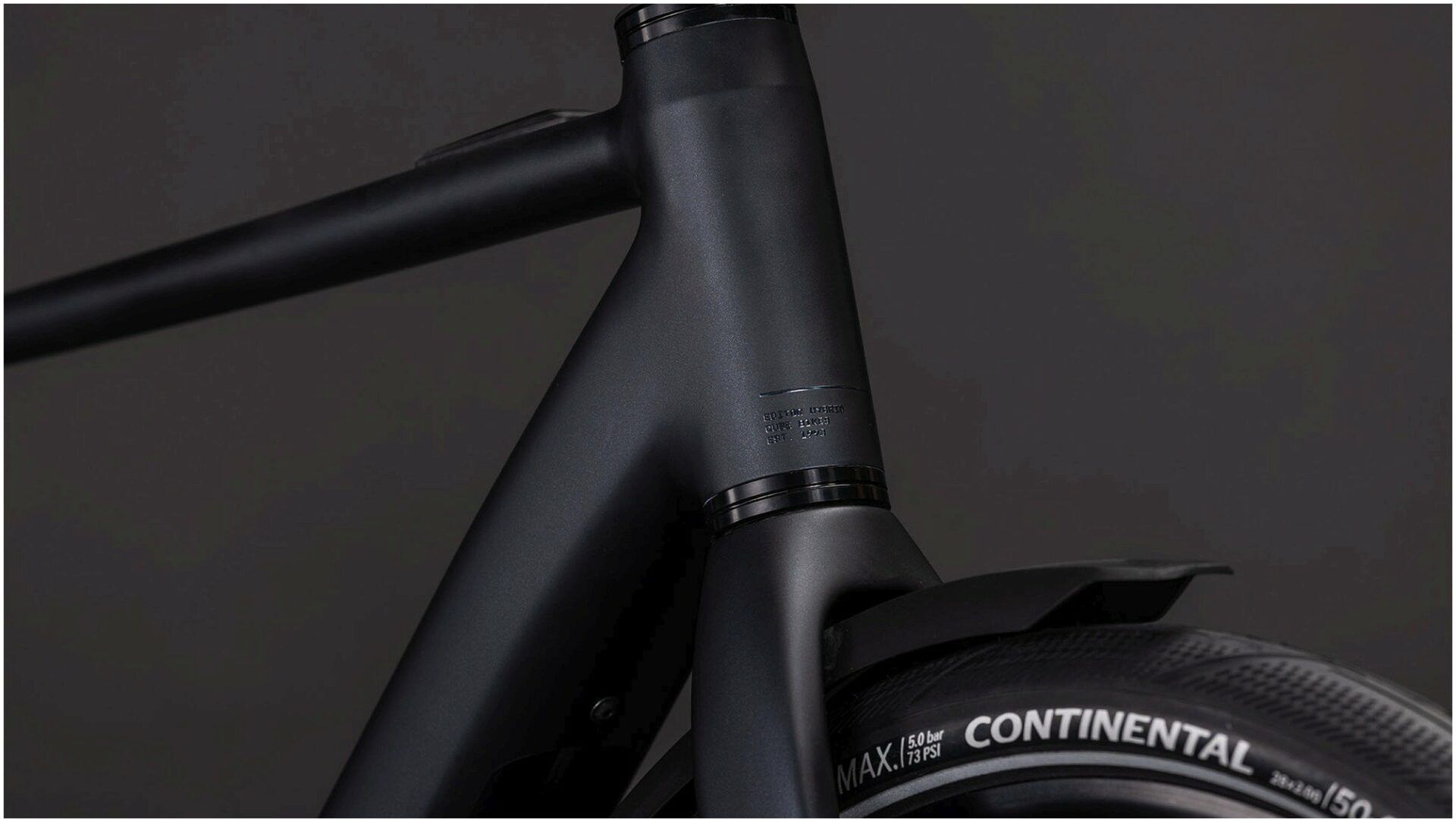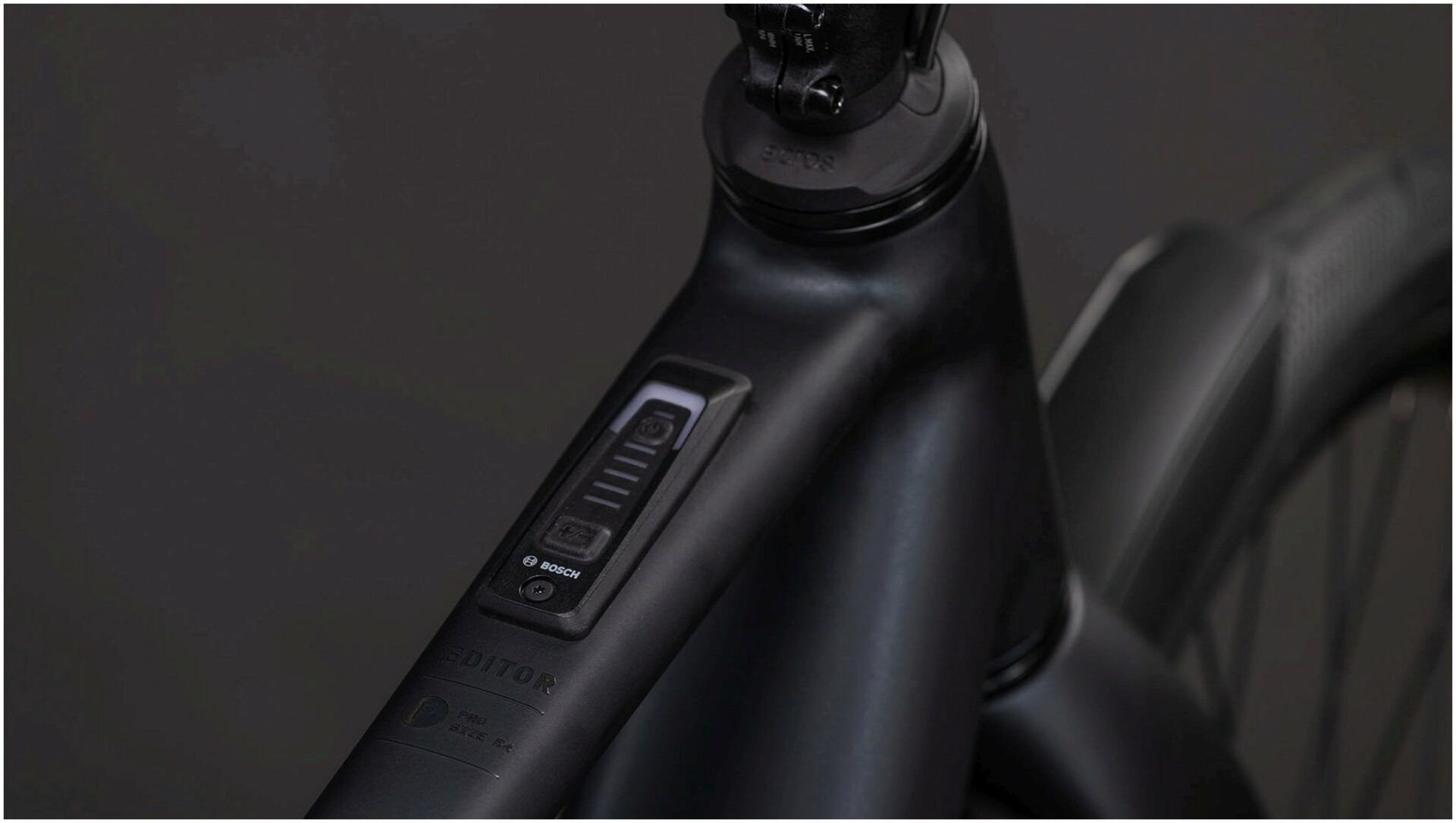 So sleek and understated is the Editor Hybrid FE's frame, at first glance it barely looks like an e-bike. Lightweight, durable aluminium construction with Smooth Welding at the main tube joints creates an elegant frame, while the full carbon fork is both light and strong. We integrated the cables to complement the frame's clean lines, and the 400Wh battery is built into the down tube to save space and weight. There's a versatile, rugged rear carrier and an optional front carrier for carrying your belongings. And we included full mudguards, a bright lighting set and a practical kickstand, so you've got everything you need.