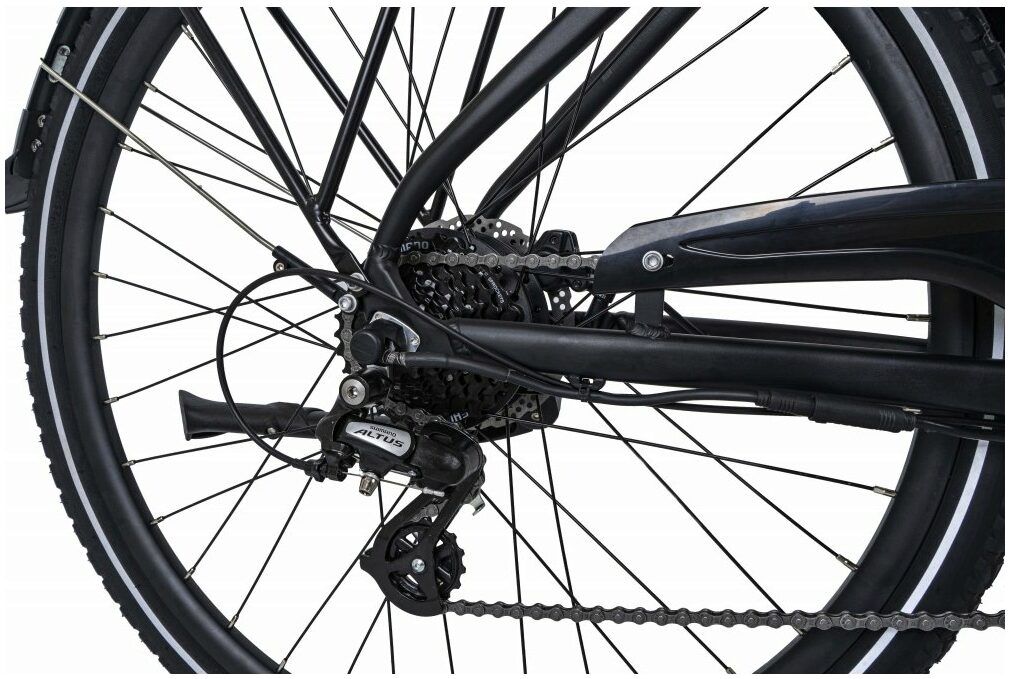 The low step frame is equipped with a neatly integrated 360wh battery that can deliver over 40 miles / 64km of assisted pedalling. The power is delivered from within the Bafang rear hub motor, a brand who is quickly establishing themselves as one of the leading bicycle motor brands with excellent build quality, performance and value for money.