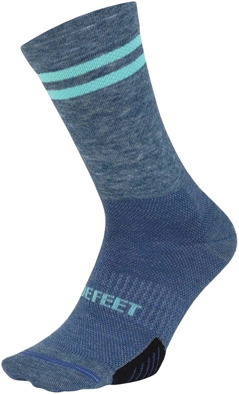 The Cyclismo Wool Blend 6" Double Stripe crew cycling sock comes in three color variations: a heathered blue with a teal double stripe, a charcoal grey with a black double stripe, and a natural with a deep brown double stripe.