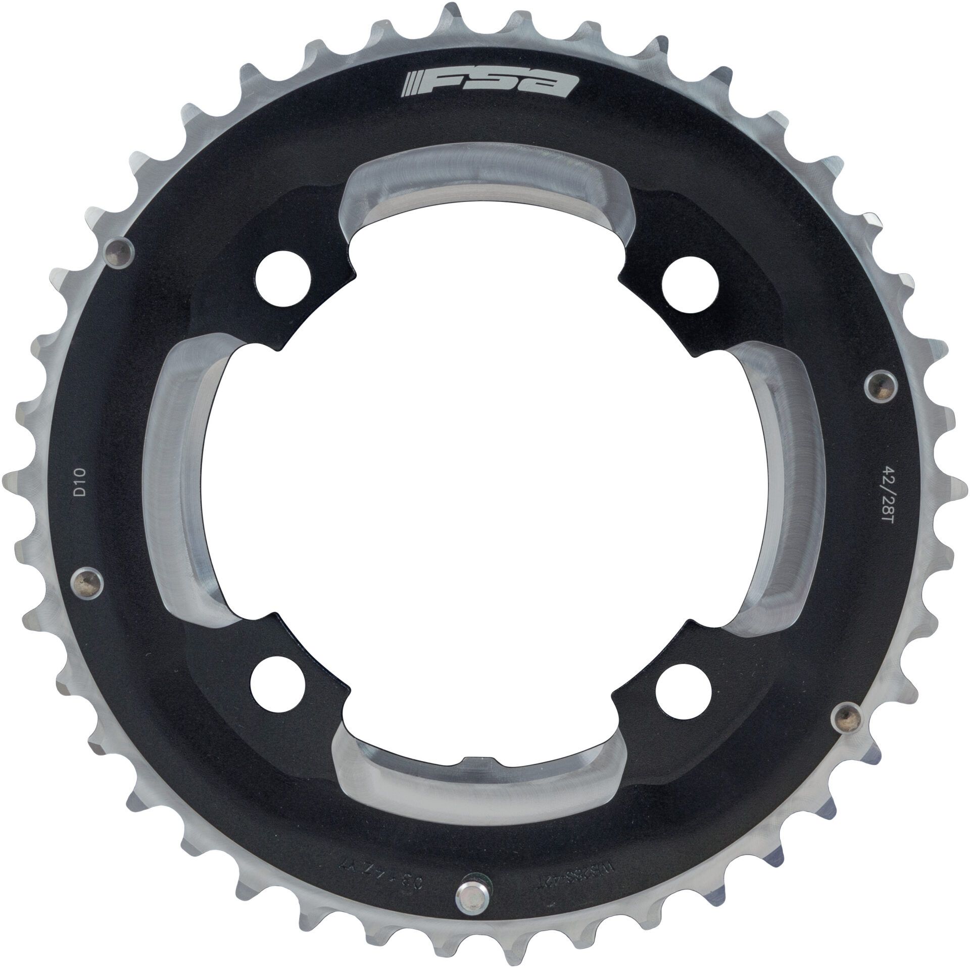 FSA Pro MTB 104BCD double 10-speed chainring with precision CNC machined AL7075/T6 alloy material with shifting ramps and stainless steel pins on outer and inner rings.