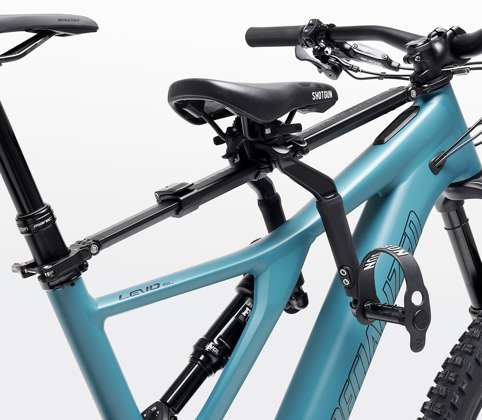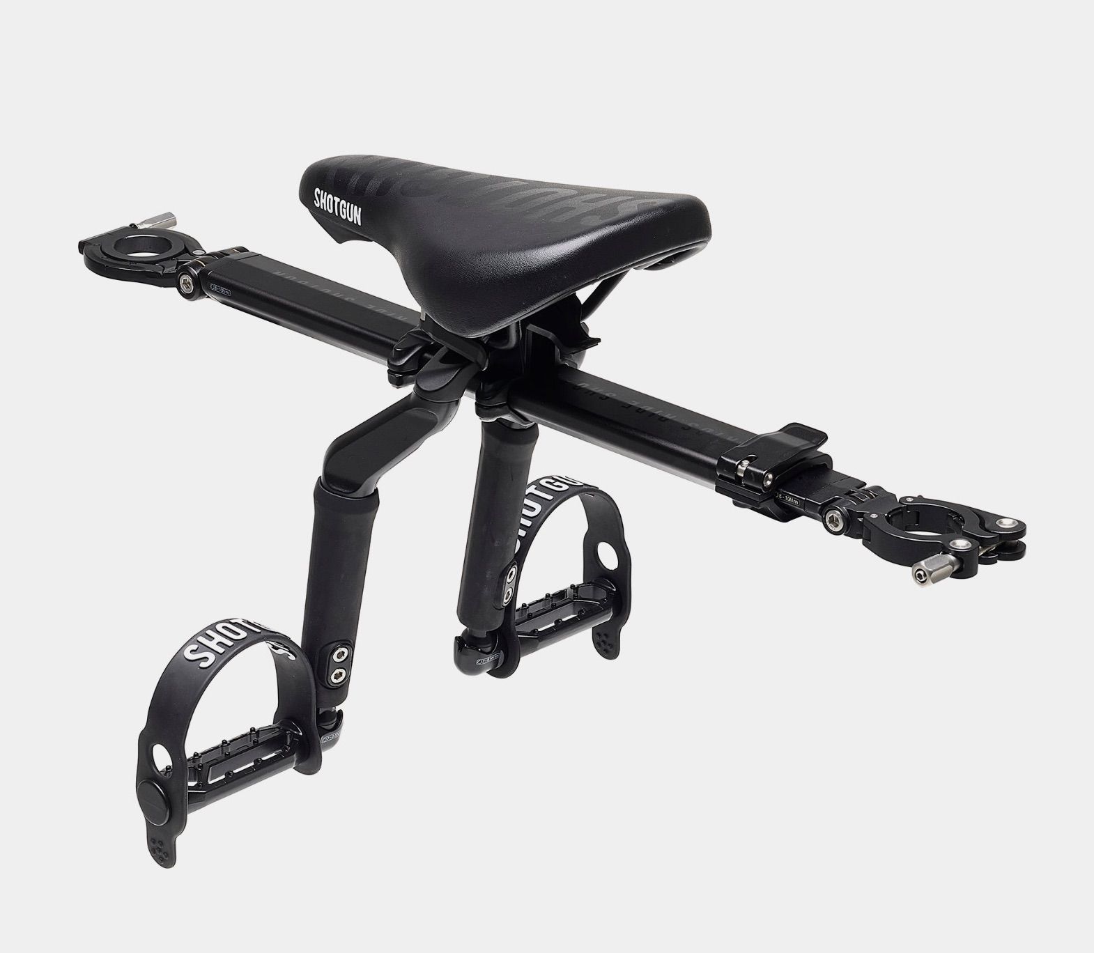 The Shotgun Pro is lightning fast to attach, remove and swap between bikes. Once the Shotgun spacer is installed, simply fasten at the headset, extend the rail and fasten around the seat post.