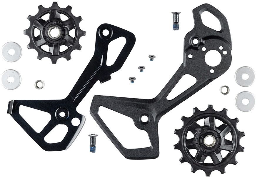 Sword rear derailleurs come with cages that are replaceable. Unscrew the 3 screws on the back of the derailleur to switch between cages. Riders should use this cage kit to repair their 1x Sword derailleur or change their 2x derailleur to a 1x version.