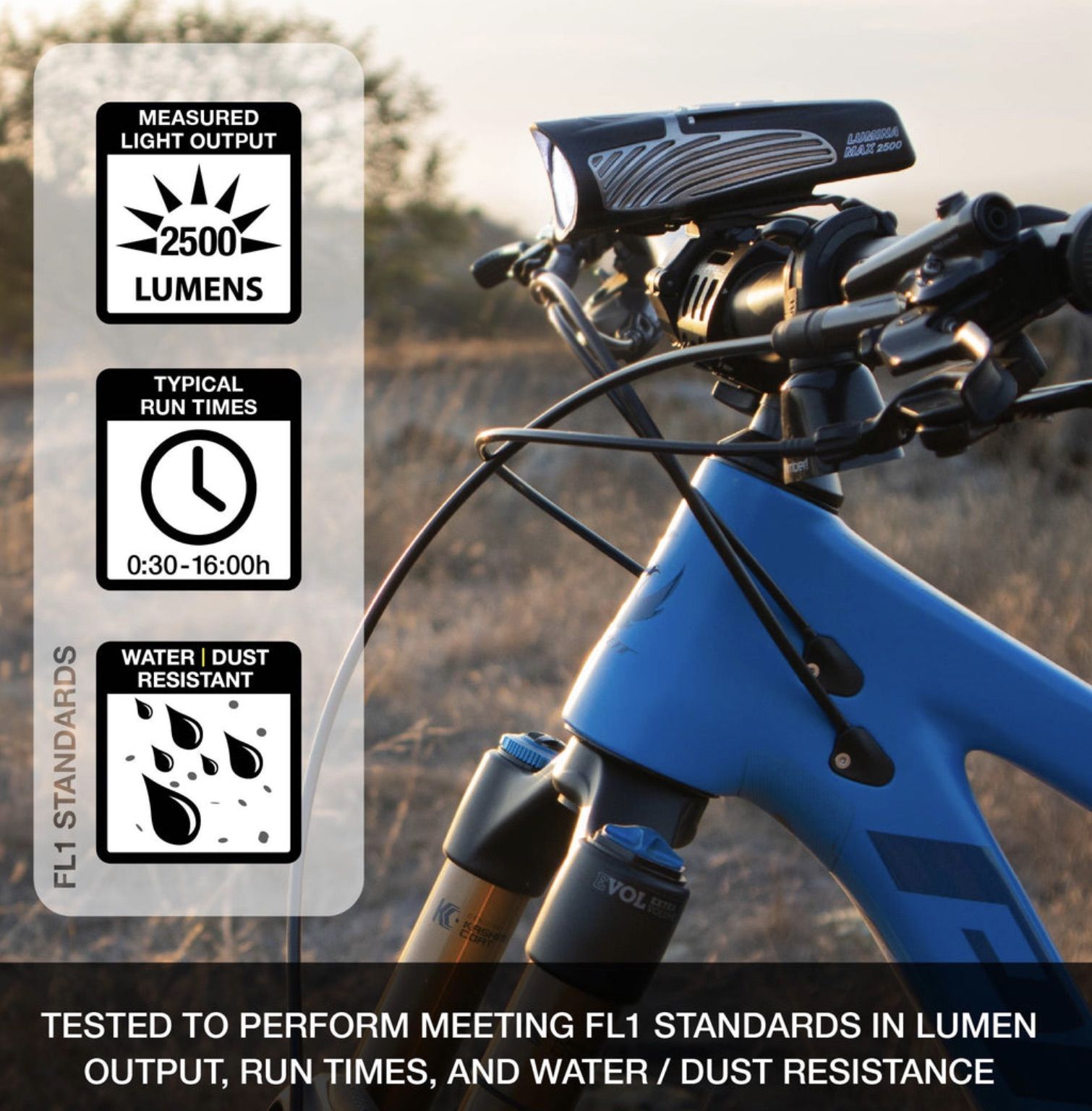 A versatile, feature-rich, rechargeable headlight, the NiteRider® Lumina™ Max 2500 features NiteLink™ wireless technology, enabling you to remotely control a compatible taillight (not included). Unleashing Max Boost or its varying modes was never more easy as riders now have the ability to control both headlight and taillight with a flick of the thumb (Taillight and NiteLink™ Wireless Remote sold separately). Additional features include an 8-Step Fuel Gauge and a highly durable light housing with Dupont® Fiberglass reinforced nylon. With Lock Mode, perfect for use during storage and transporting the light. Press and hold power button for 8-10 seconds to lock out operation of light.