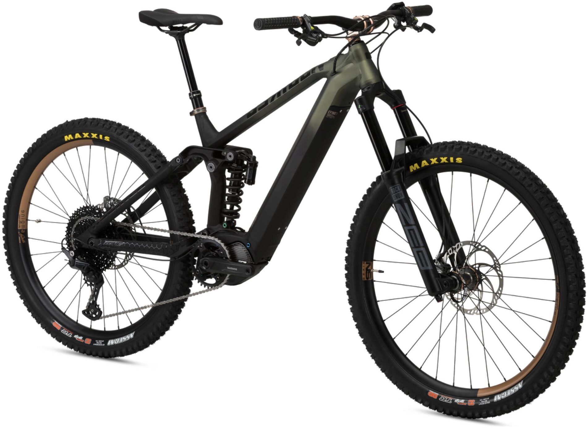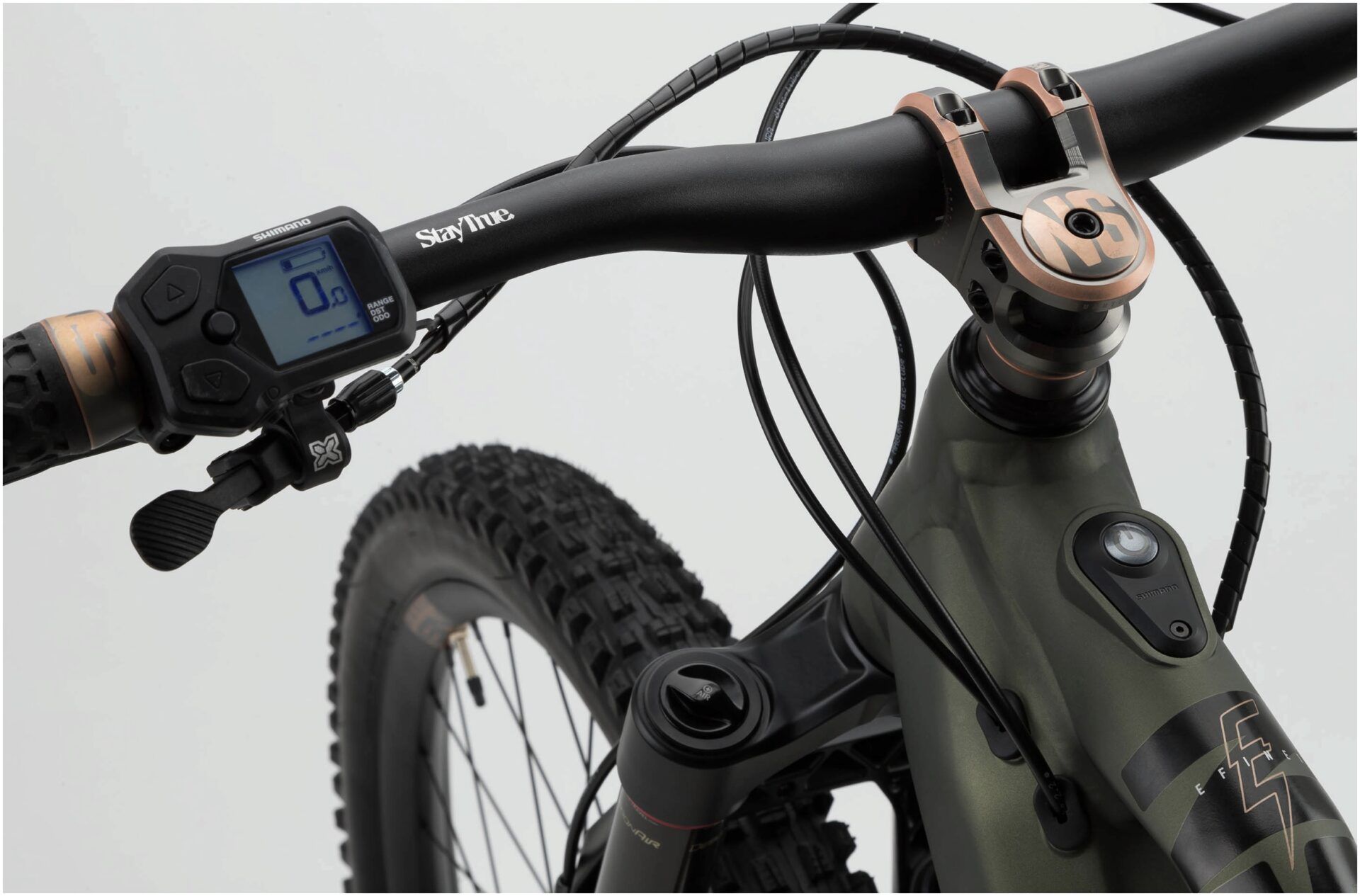 - Frame: NS Bikes E-Fine AL with 160 mm travel, AL6061-T6 + AL6066-T6, custom hydroformed tubes, Shimano EP8 drive unit, integrated Shimano high-capacity battery