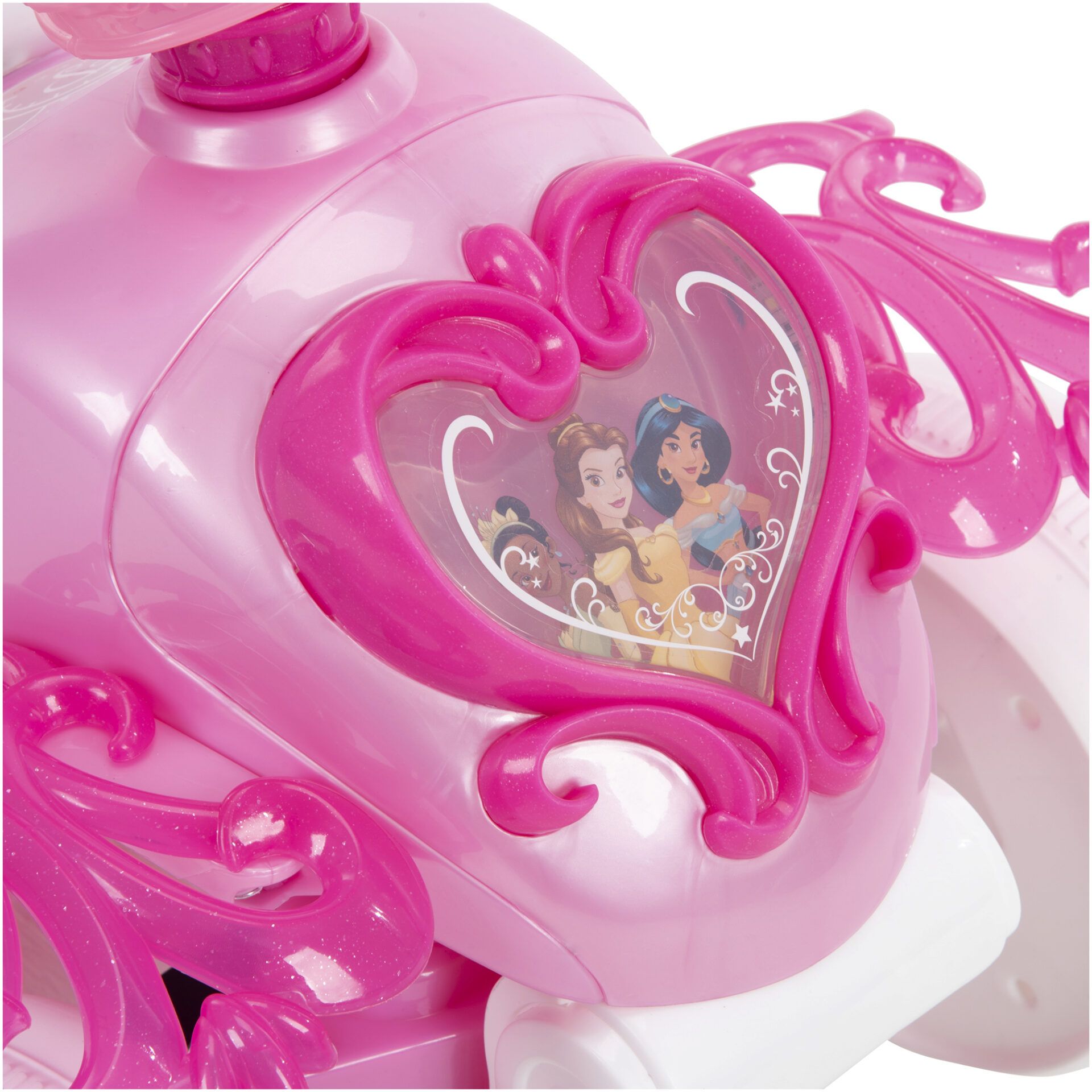 One of the standout features of this ride-on is the multi-dimensional display that lights up with famous Disney Princesses, including Tiana, Belle, and Jasmine. Your child will be delighted as they ride around with their favorite princesses by their side. To add even more fun to the ride, simply press the push button to activate sounds that bring the Disney magic to life.