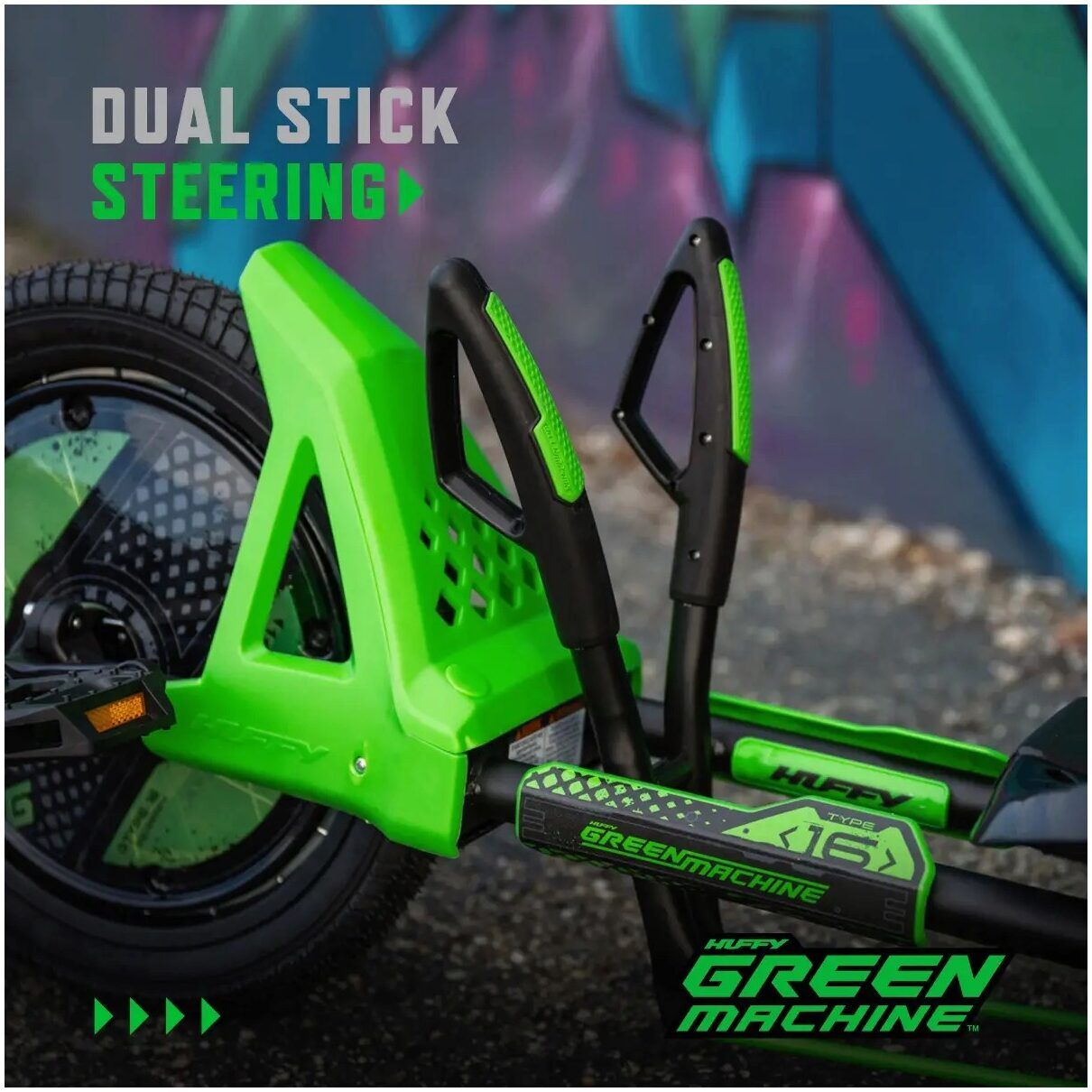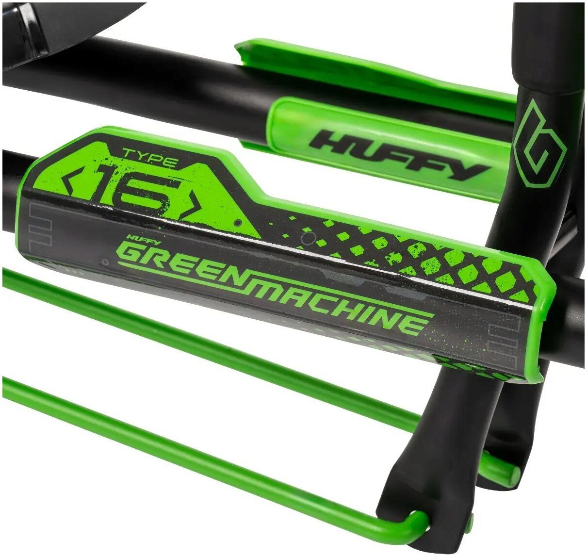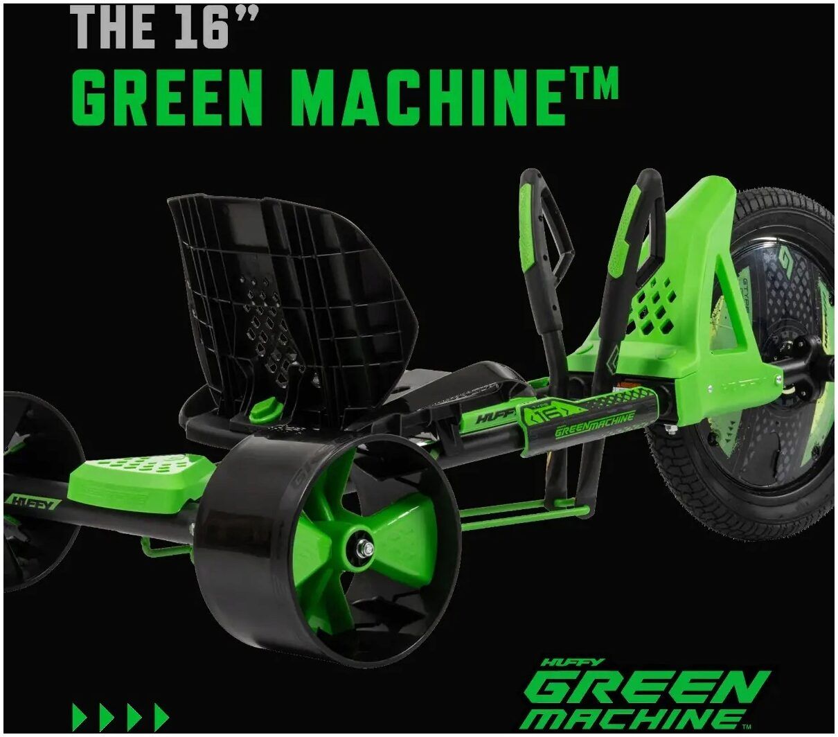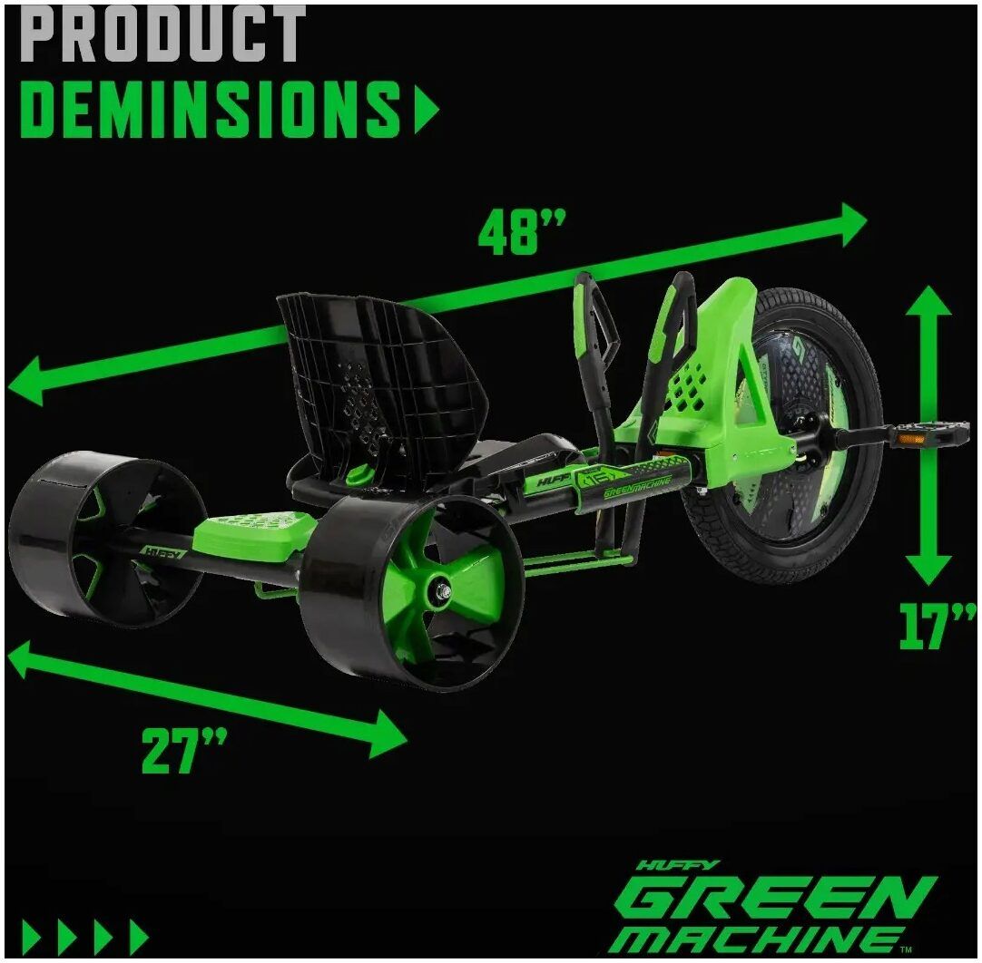 The 16” Huffy Green Machine boasts premium specs, a sleek design, and the Green Machine thrills you know and love.