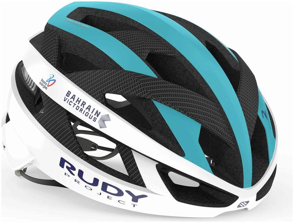 Worn by the team and bedecked in its colours, the Team Bahrain Victorious Rebel Road Helmet features Rudy Project's cutting-edge technology and safety credentials. Beyond accepted standards, it offers rotational impact protection, while a carbon shell dissipates other forces.