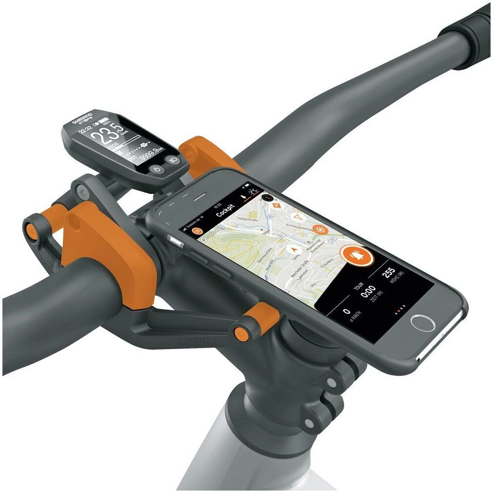 The Compit+ system consists of a smartphone holder and a power bank with an integrated NFC chip. Any mobile device equipped with a wireless charging function can be connected to the +Com/Unit and charged on the go. With a single twist, the smartphone can be mounted horizontally or vertically thanks to the oversized bayonet mount. The mobile phone holder can be easily mounted on a wide variety of handlebar geometries.