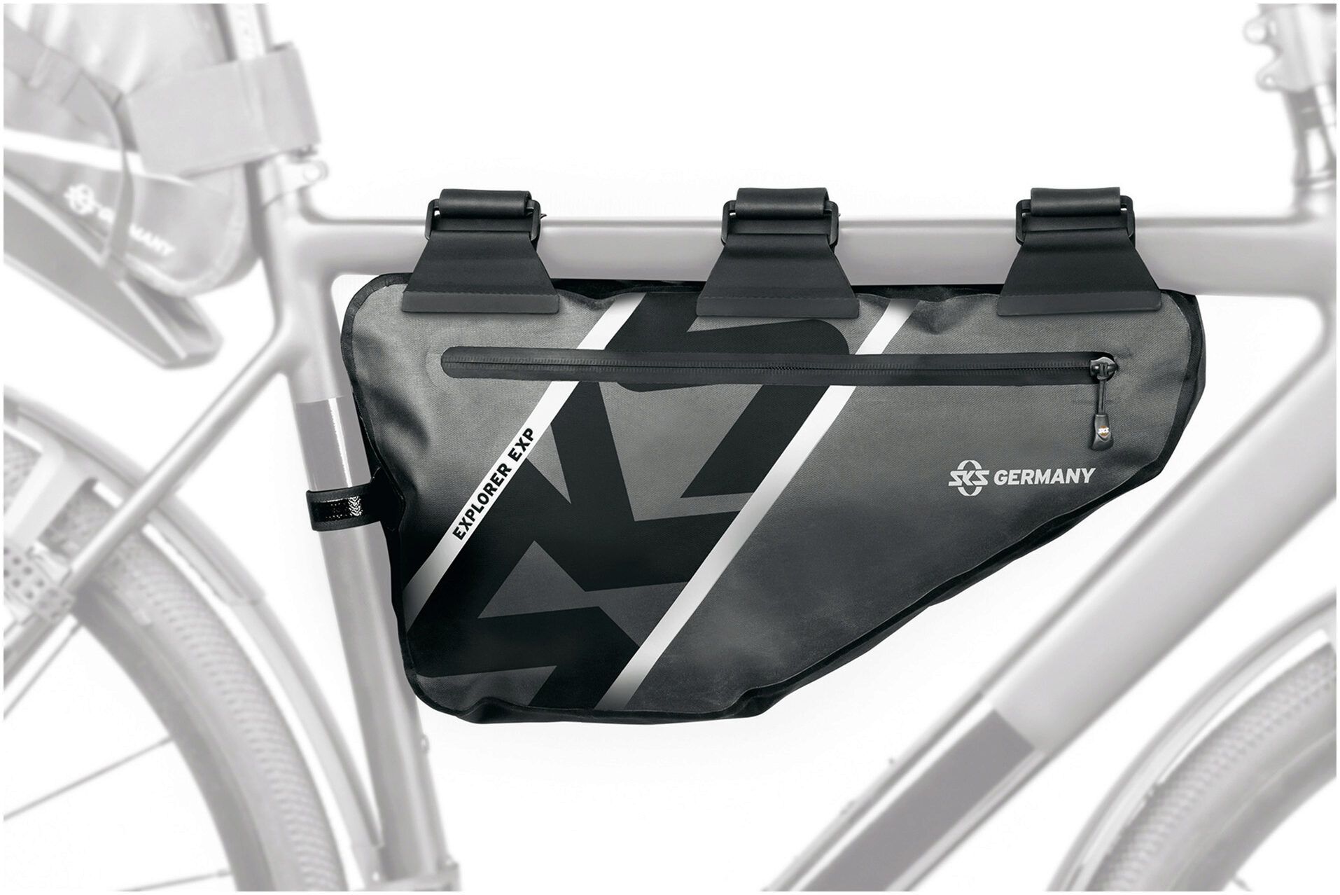 It’s all in the centre. The Explorer EXP. Framebag provides 4 litres of storage space without affecting the bike’s handling behaviour. A jacket, repair kit or packed lunch can transported and protected from water and dirt thanks to the waterproof material with welded zips. The extra pockets for a tool or a mini pump, such as the SKS Airflex Explorer, can be accessed with one grip. The rubberised brackets with strong hook and loop fasteners, enable gentle and individually adjustable mounting to the frame.