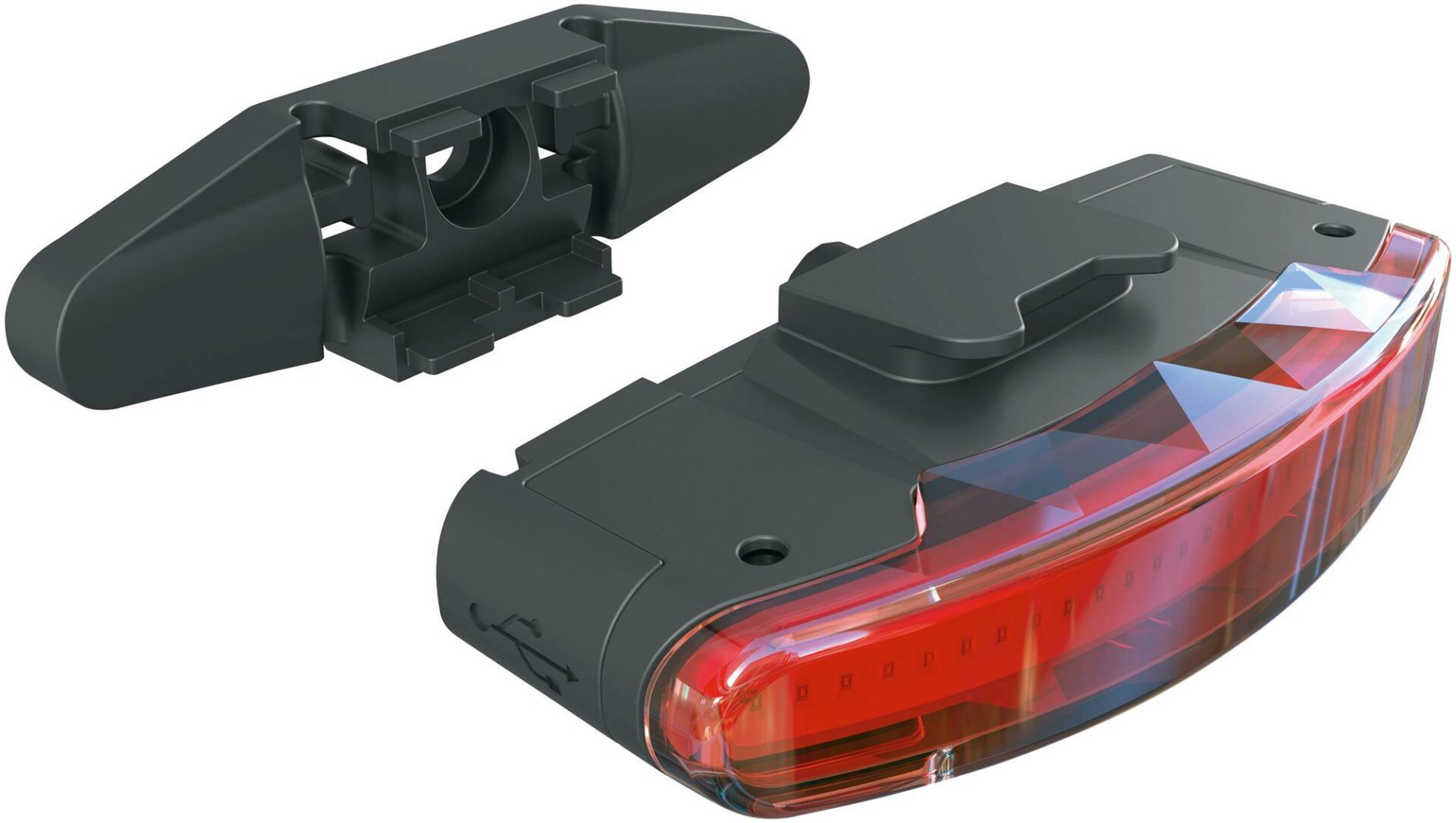 The Infinity Universal Rear Light with an integrated battery can be recharged via a USB connection. The rear light is equipped with a save switch and a battery charge indicator. The battery lasts up to five hours.