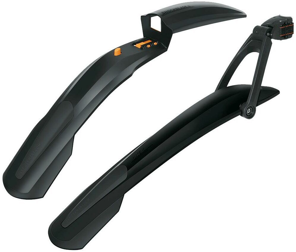 The double-jointed bridge clamps the dirtboard profile twice and is extremely resilient. The mudguards in a black/grey design are suitable for many common wheel sizes as well as for tyre widths up to 3.0 inches.