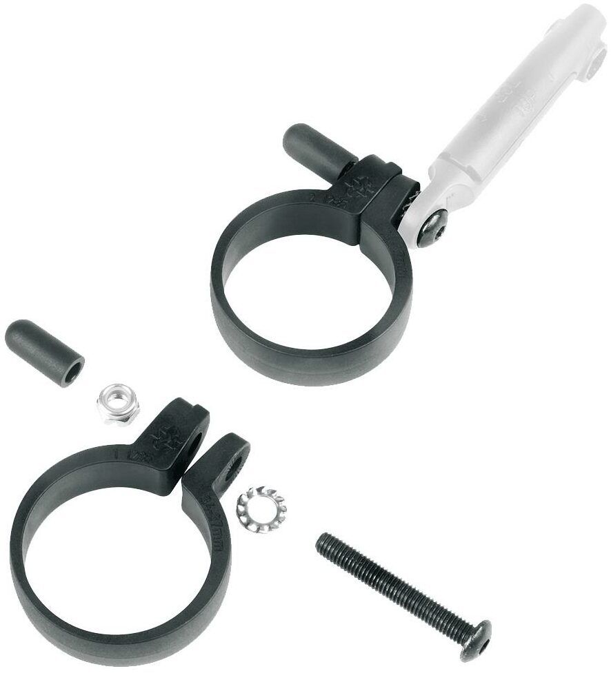 The mounting clamps can be used to attach stays simply and easily to suspension forks. With a rubber cap on the screw ends. Includes screws.