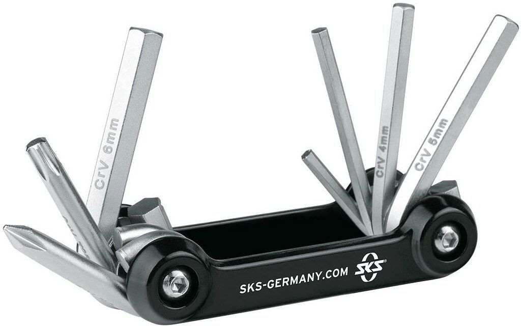 With the 7 integrated functions, such as an Allen key, screwdriver and torx key, many repairs to your bike can be carried out quickly. The multi-purpose tool can be conveniently stored in the neoprene bag provided.