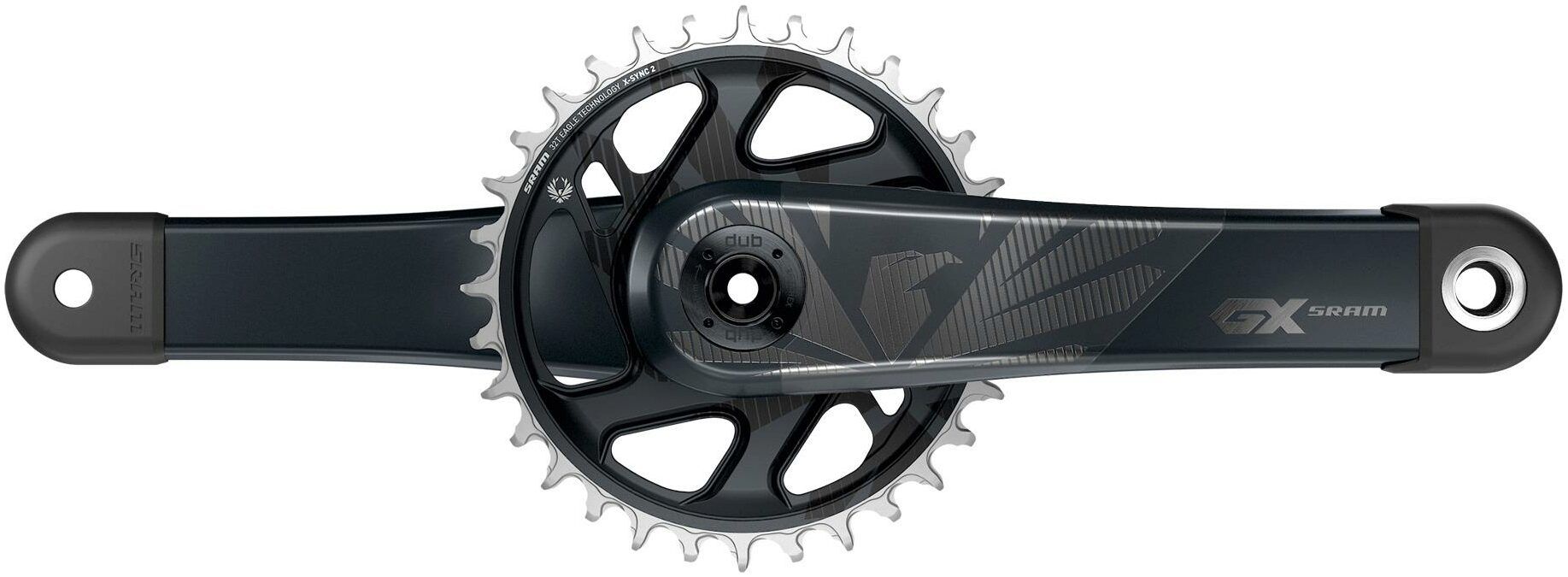 The SRAM carbon GX Eagle crankset delivers consistent performance every time out. Featuring SRAM's X-Sync 2 tooth profile chainring, the Carbon GX crankset is engineered for complete chain control. Each tooth's thickness is precisely toleranced and controlled to work seamlessly with the chain's inner and outer links. DUB technology features a better-engineered bottom bracket and a new spindle design. Together, these allow for a more uniform approach to bottom bracket fitment, better sealing against contamination and forward and backward compatibility. Now everyone can benefit from a new measure of durability.
