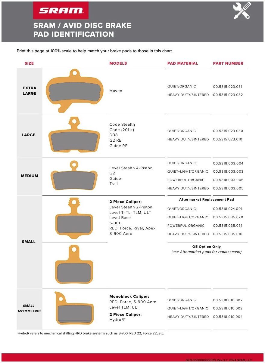 Small brake pads are used on SRAM's two-piston road brake calipers. The brake systems that the small pads cover are: