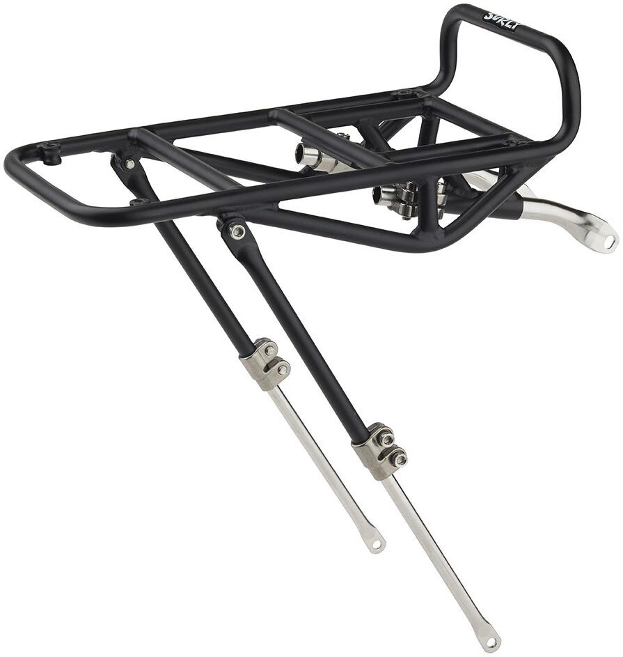 A traditional-style Porteur rack that mounts securely to mid-blade and crown eyelets of Surly forks, making it compatible with fat bike and 29+ wheels.