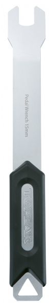 15mm open end wrench tool for installation, removal and maintenance of pedals. Offset angle keeps knuckles away from crank arms and chainrings. Long padded handle for better leverage and comfortable use.