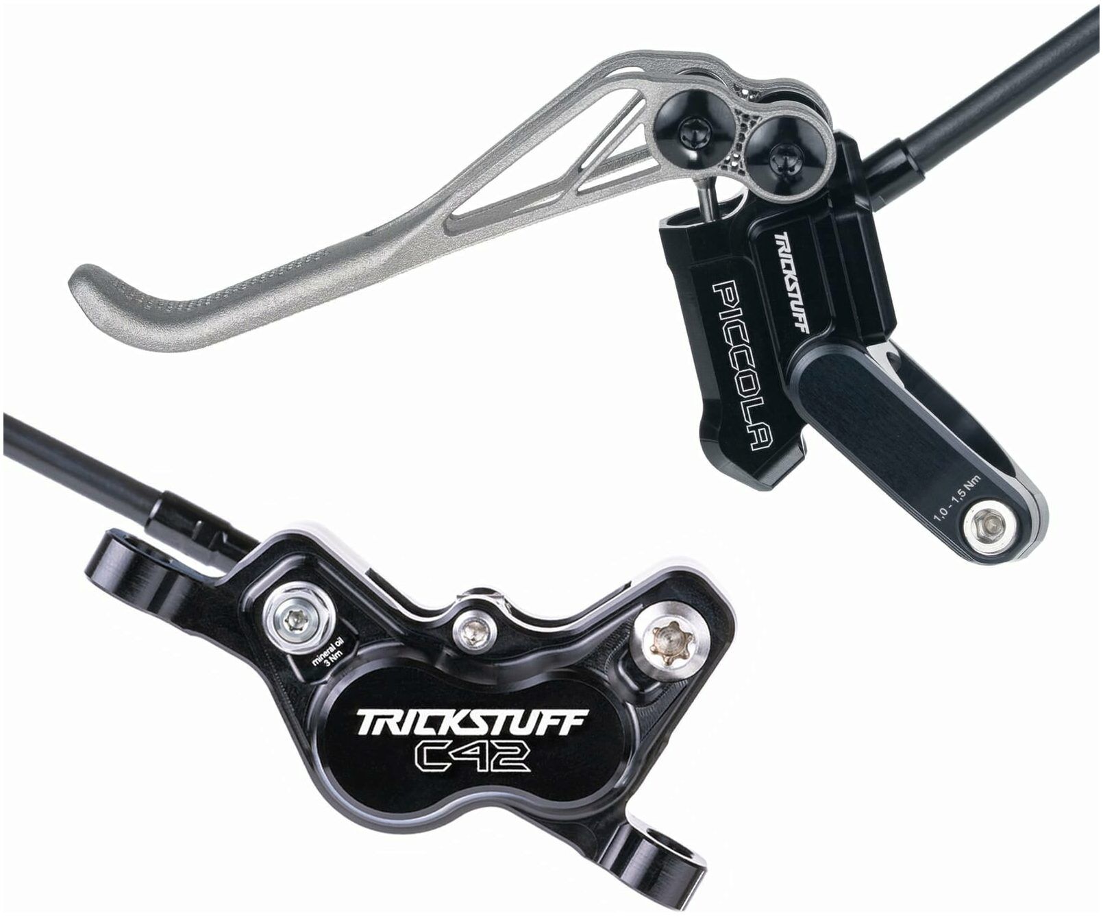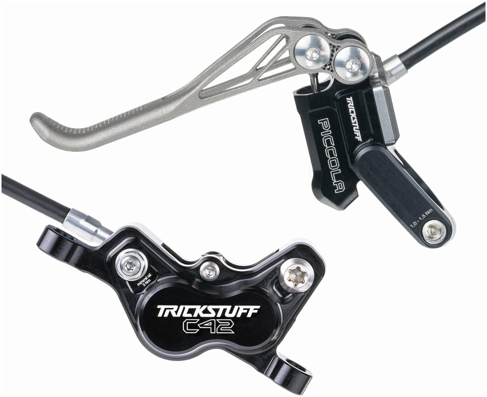 The C42 callipers use heat resistant, hollow stainless-steel pistons that absorb and release buildup, along with a high-pressure resistant Kevlar hose, and the brake set is powered by Trickstuff's Bionol.