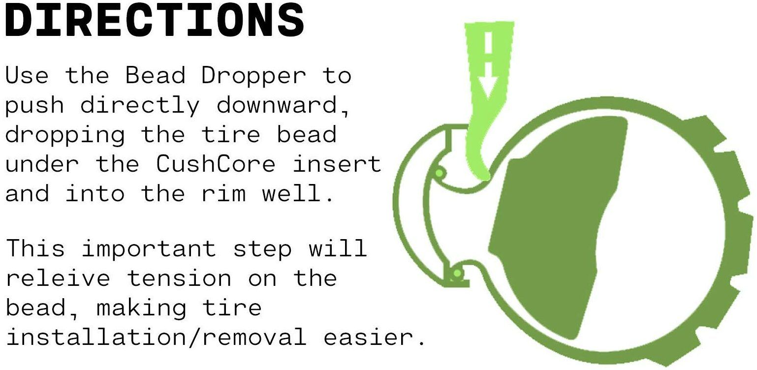 The CushCore Bead Dropper - The Ultimate Tyre Lever. The Bead Dropper tyre tool significantly helps in removal and installation of CushCore tyre inserts. Especially the critical step of dropping the bead into the rim channel.