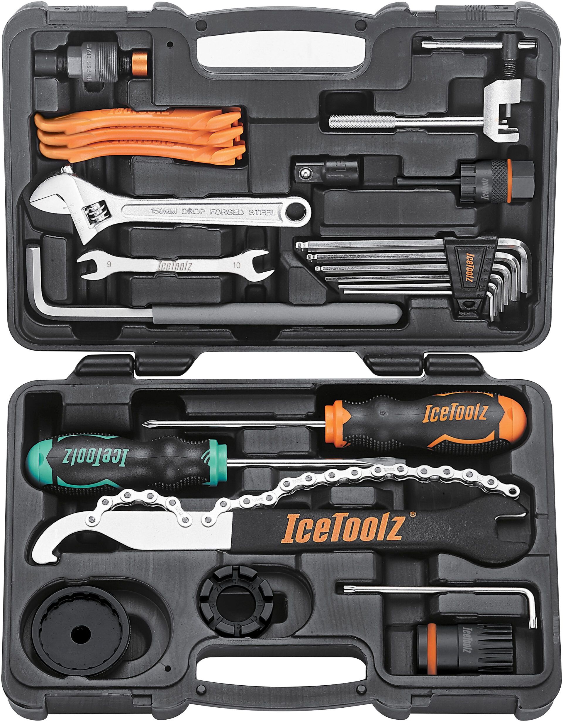 IceToolz professional set of bicycle tools neatly together in a suitcase.