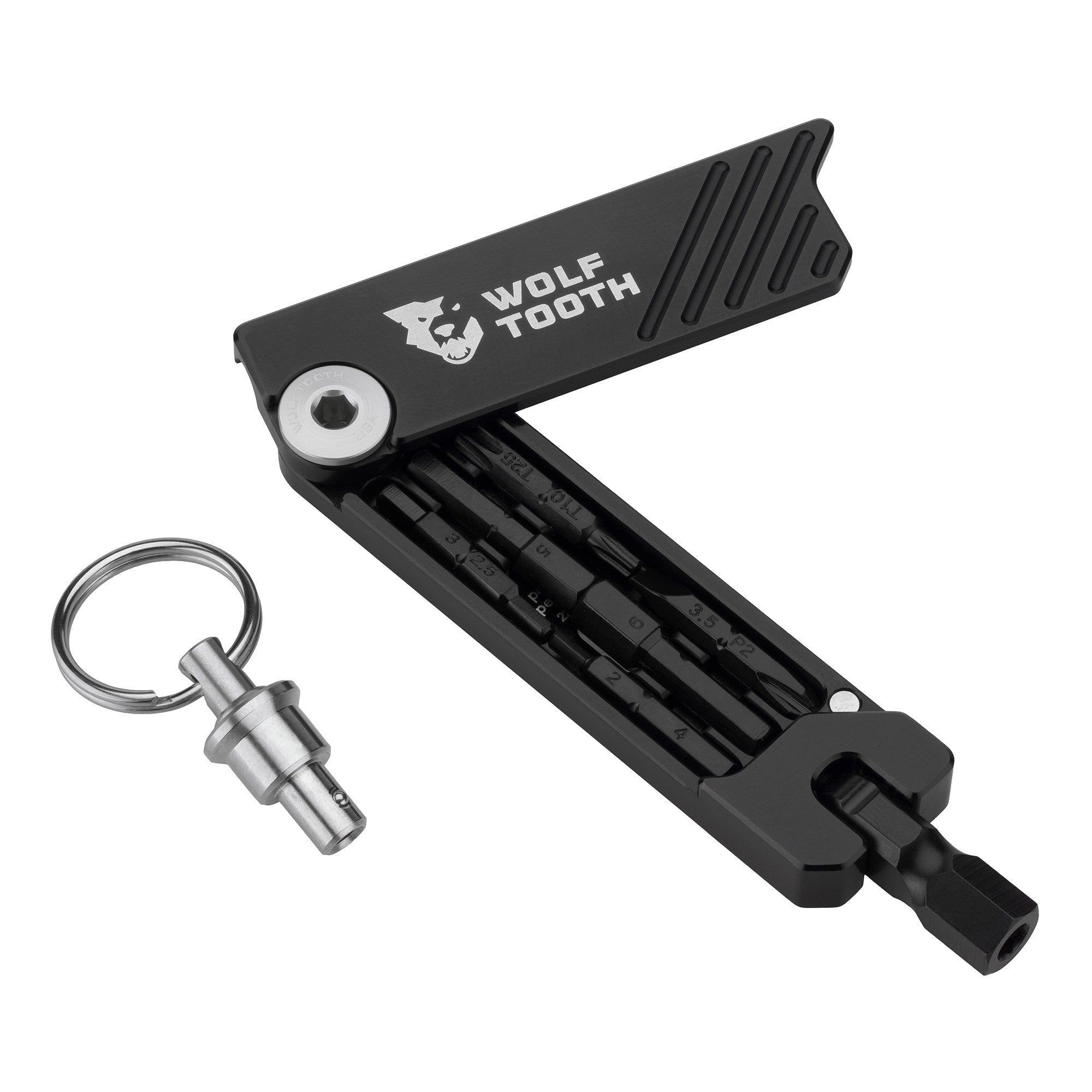 The new Wolf Tooth 6-Bit Hex Wrench is a slim, strong multi-tool with 11 functions for common bike repairs and everyday needs. Six hex bits are stored inside the handles that fit into the end of a ball detent swivel head for use. The 11 functions include: 2, 2.5, 3, 4, 5, 6, and 8mm hex; flat head #3.5 and Phillips #2 screwdrivers; and T10 and T25 Torx-compatible bits. All bits are ED-coated and corrosion-resistant. It is small enough to fit into a riding tool wrap or pocket, and has an optional keyring attachment to fit on any keychain for use away from the bike.