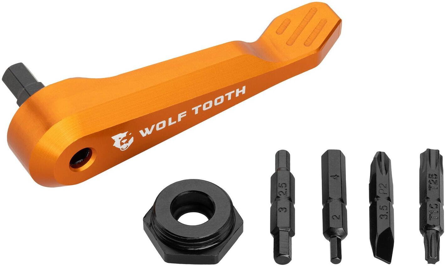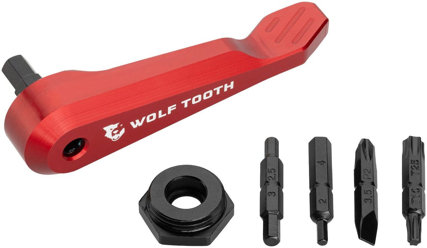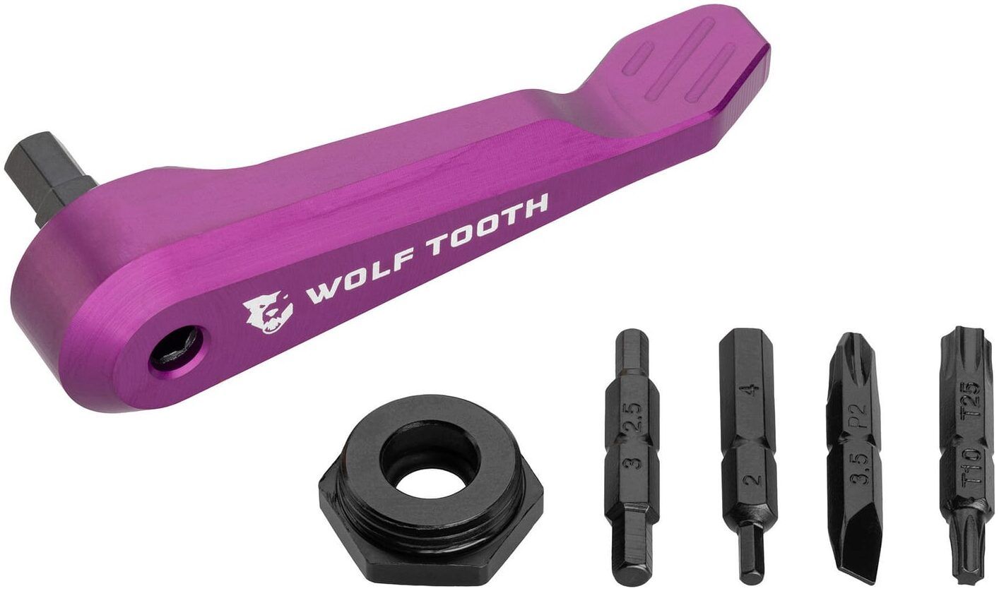 The Wolf Tooth Axle Handle Multi-Tool is a minimalist, lightweight option to cover 10 essential tool functions. It is stored at the end of a Wolf Tooth rear axle during rides as a multi-tool that is easy to access for quick adjustments and trailside fixes.