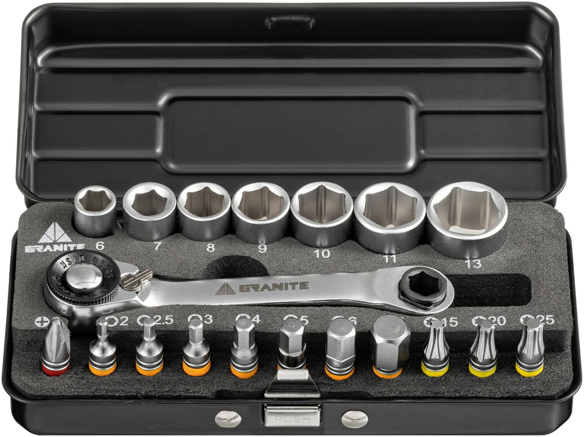 A compact, robust metal tool box perfect for any task. It includes a dual head hex bit and hex socket ratchet wrench, 7 hex sockets and 11 precision tool bits, ensuring you have the right tool for every job. Durable and portable, the Duet Tool Box offers the perfect blend of performance and convenience for both professionals and DIY enthusiasts.
