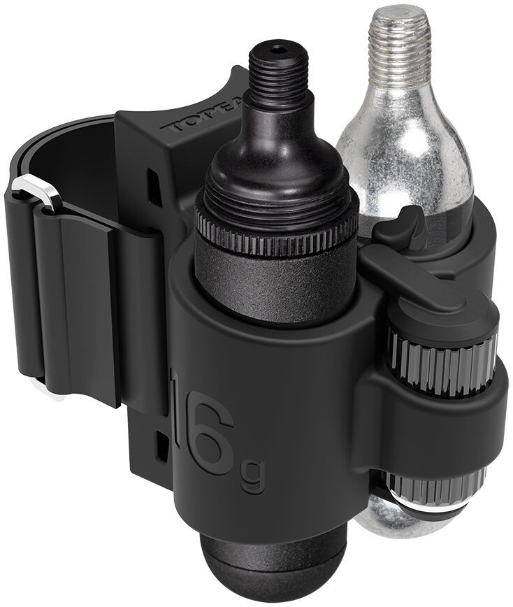 A compact frame tube mount, multi-function tubeless tire repair and CO2 inflation kit featuring the Nano AirBooster CO2 inflator, TubiCartridge R16, and one 16g CO2 cartridge for road bikes. The included mounting module with a grip strap allows the TubiMaster RX to be attached to a seatpost or bike frame with ease.