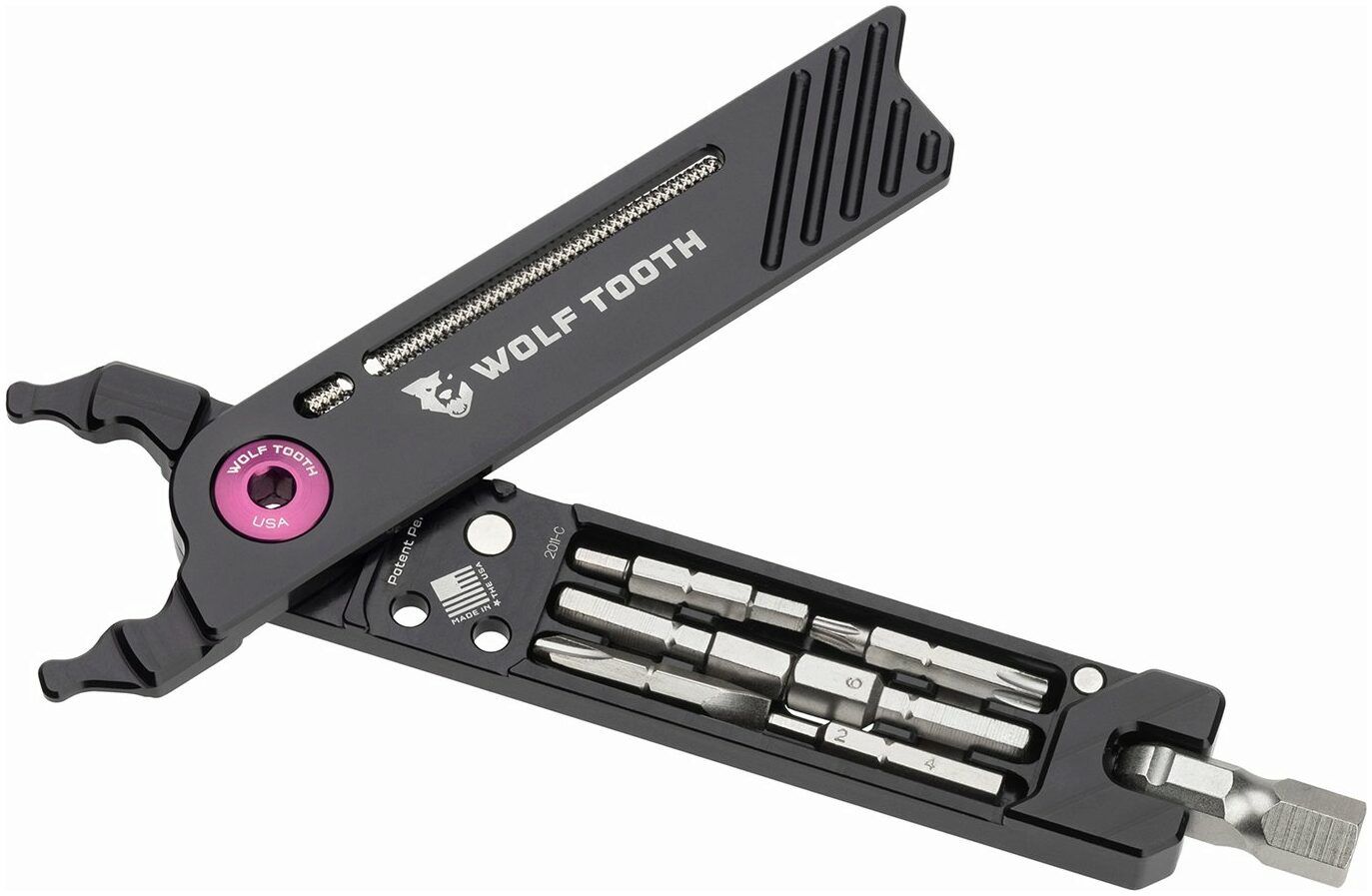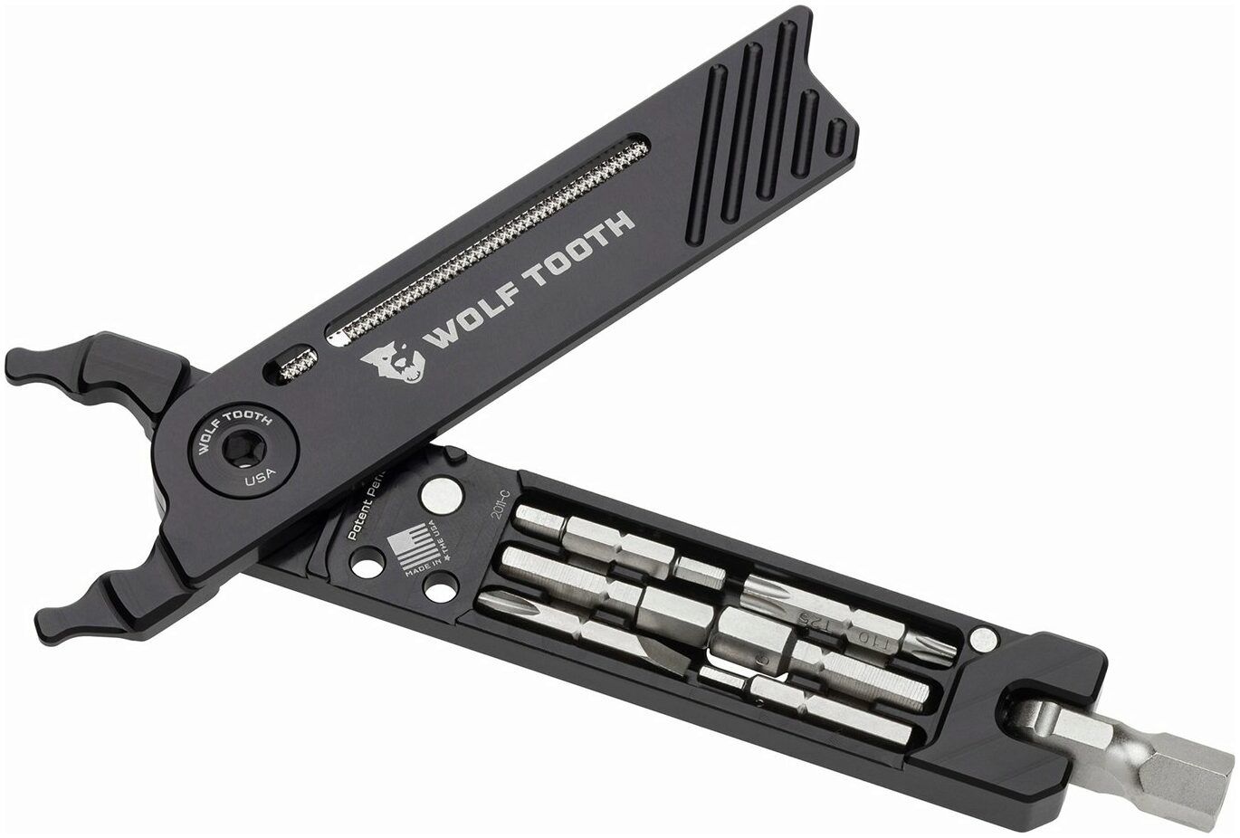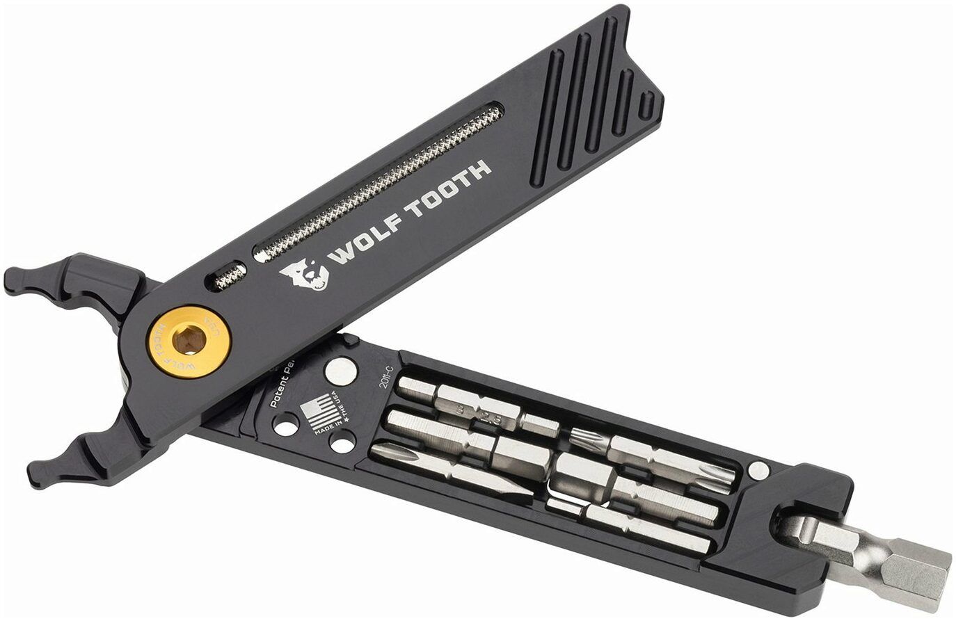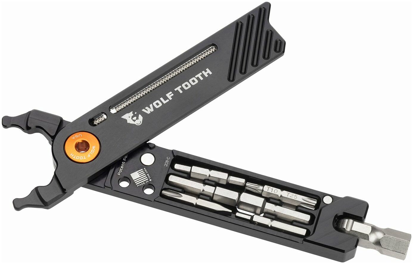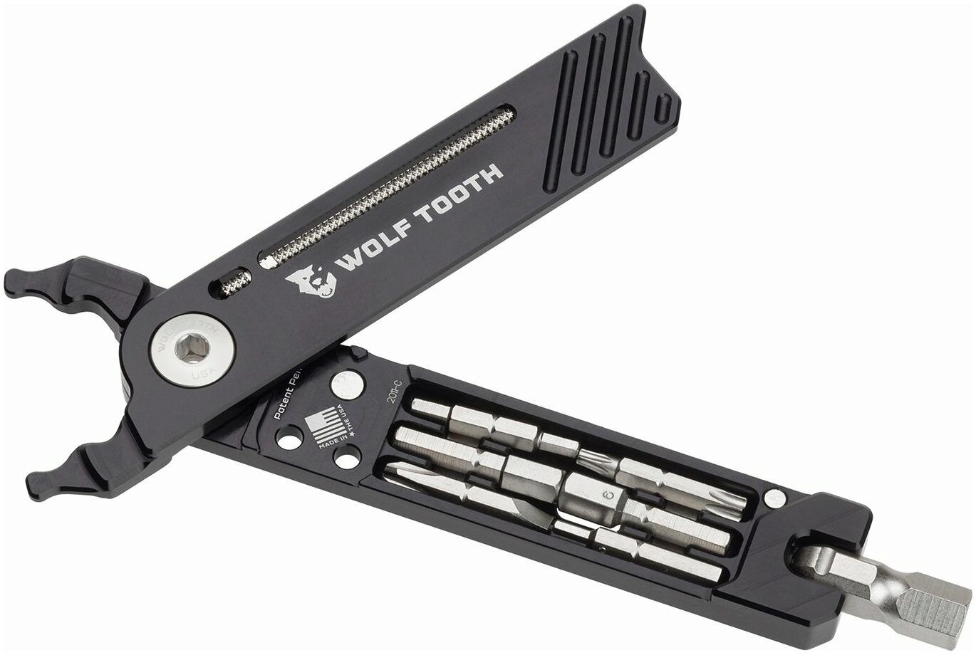 Wolf Tooth's 8-Bit Pack Pliers can solve almost any minor roadside repair whether road cycling, gravel riding, or mountain biking. 17 functions from master link pliers to Torx bits bring superb functionality in a lightweight design, made in the USA from aircraft-grade aluminium. Eight attachments nestle in the pliers and are held in place with magnets. The attachments can be attached to a ball dent swivel head that doubles as an 8mm hex bit. When the swivel head is angled, torque can be added to break loose a stubborn bolt or pedal. Unbent the swivel head acts like a screwdriver for quick unwinding. The master link pliers borrow their design from Wolf Tooth's pack pliers. They can be used to install and remove a master link, as well as tighten and loosen a valve stem lock nut. There is storage space inside the 8-Bit Pack Pliers for a spare master link. A rasp is stored in one side of the pliers, which can be used to dislodge any stuck sealant in tubeless valves.