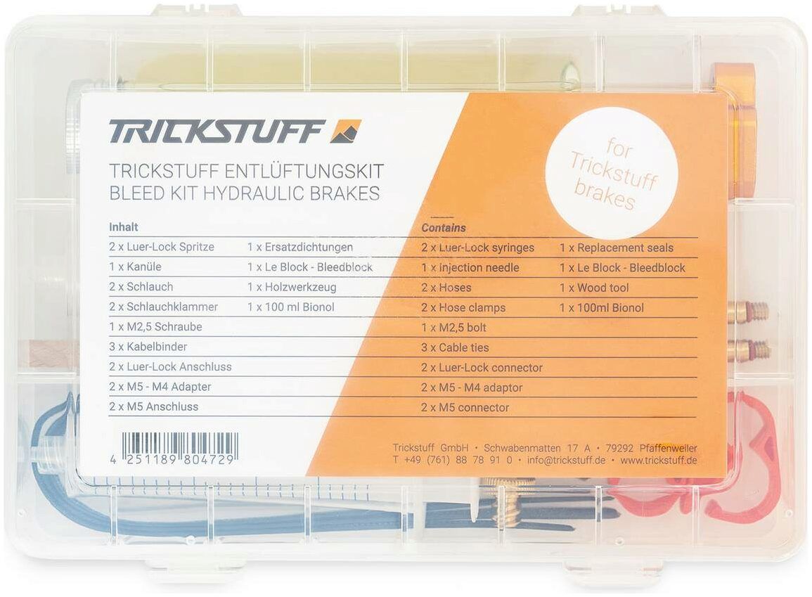 The Bleedkit contains all of the necessary fittings, syringes and hoses to bleed Trickstuff's disc braking systems, enabling you to change the brake fluid yourself.