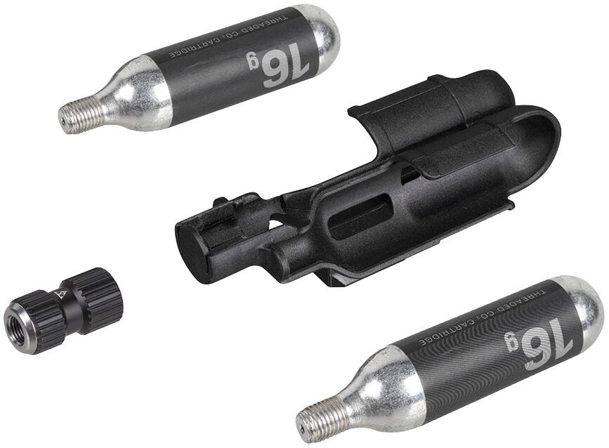 Ultra compact CO2 inflation kit featuring a Nano AirBooster CO2 inflator and two 16g CO2 cartridges. Mounts to saddle rail with included Duo Fixer which provides dual use with Topeak Duo Fixer system accessories.