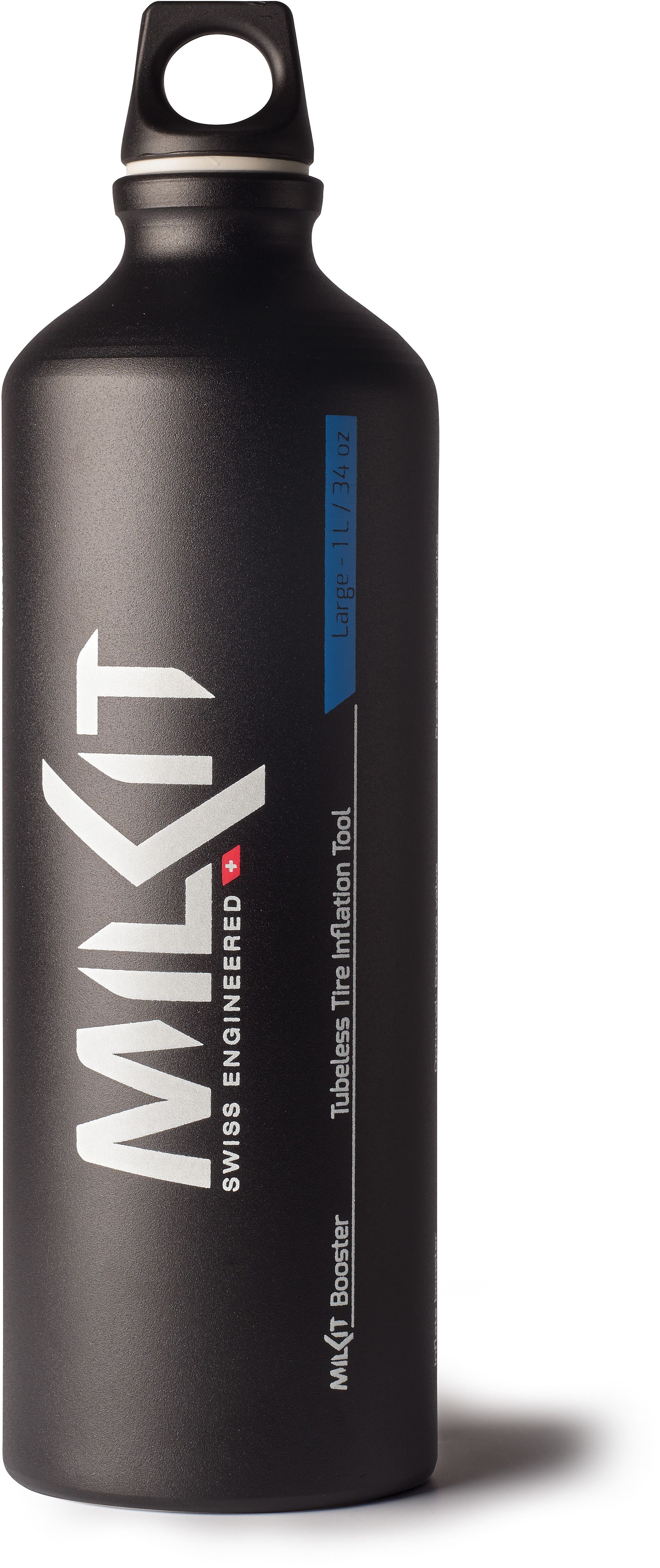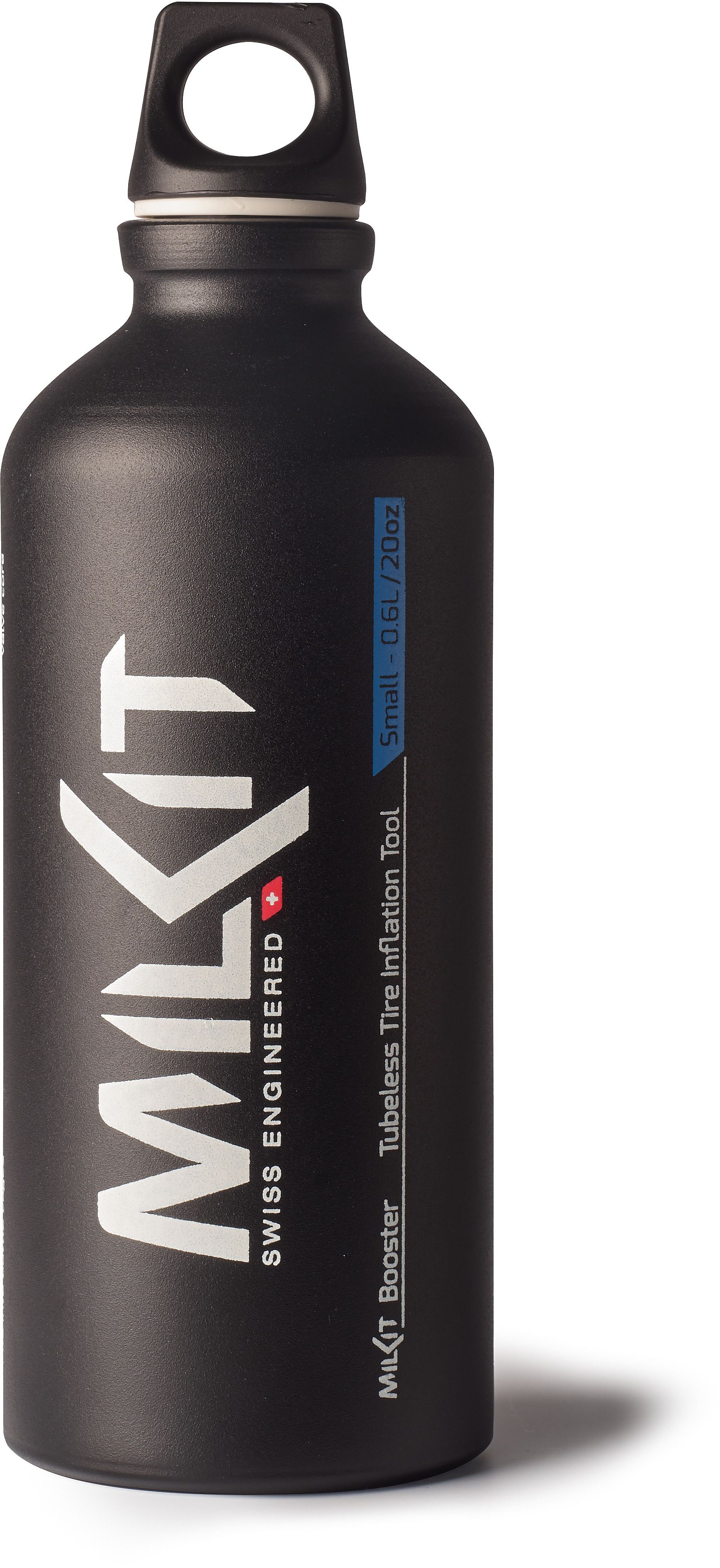 The milKit booster is a modular system that allows you to use larger bottles for home use or stubborn tyres and smaller, more portable bottles for enhanced portability and easier to mount tyres.