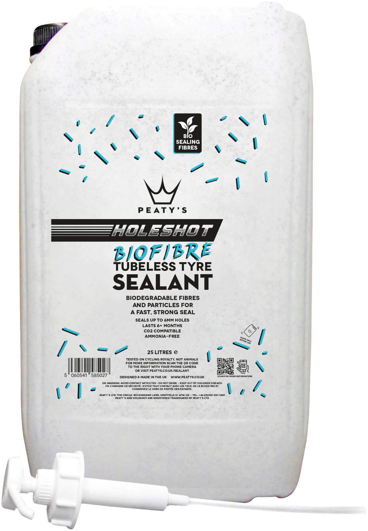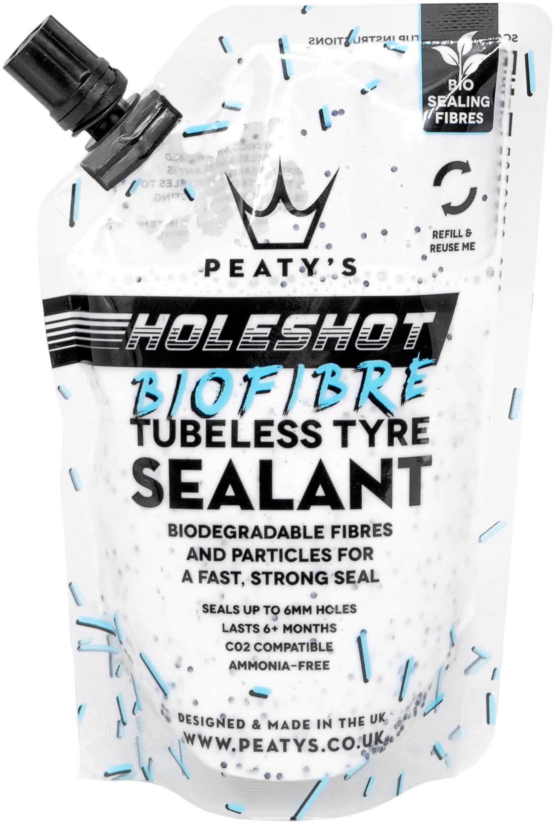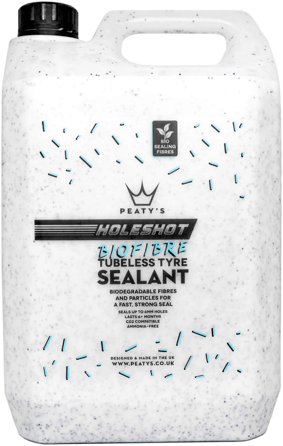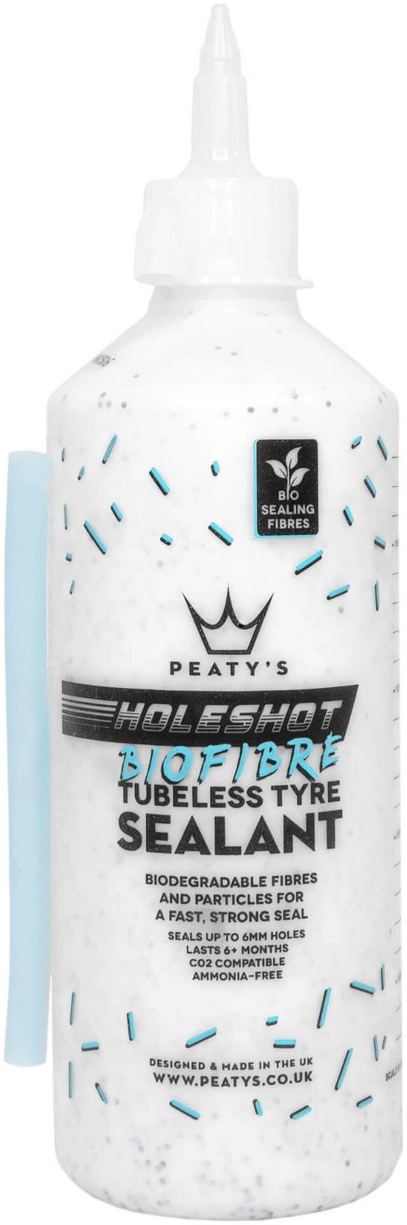 Developed alongside World Cup mechanics and world champion racers. Peaty's Holeshot Tubeless Sealant is packed full of biodegradable fibres & sealing particles to give a fast and strong seal. Using the latest fast-acting latex, our water-based sealant is ammonia-free, non-hazardous and lasts up to 6 months in the tyre in temperate climates*. It won't ball up in the tyre and is easily washed out. Our biodegradable fibres and particles bind together with the fast-acting latex to create a clot (like platelets in your blood) to quickly & effectively seal holes and tears up to 6mm.