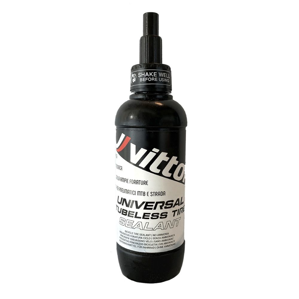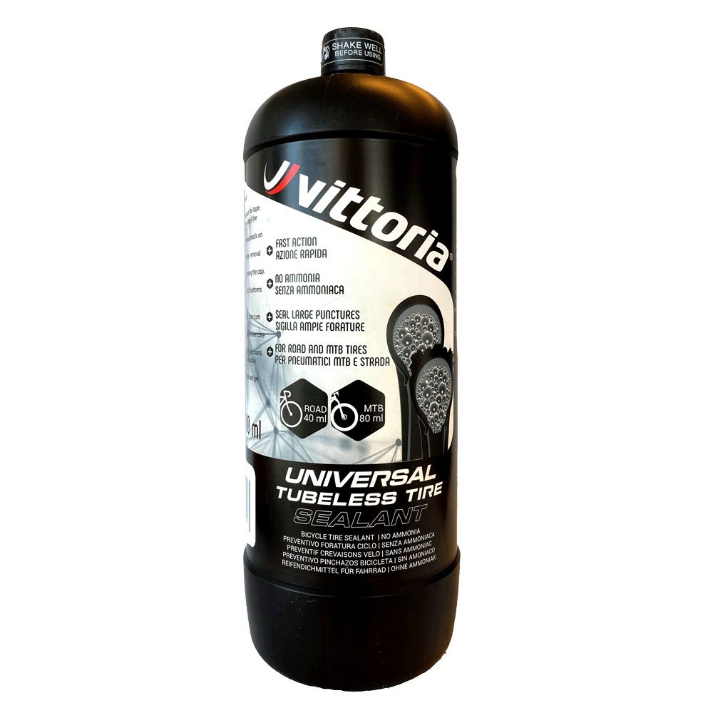 New solvent free tyre sealant formula by Vittoria. It has been specifically developed for TNT tyres and it can be used with standard UST as a means of flat prevention without any problem. The secret to Vittorias Universal Tubeless Tyre Sealant is in the liquid base, which is thin enough to find and seal even the smallest punctures quickly and effectively. Suspended within that base are platelets, which clog together to seal larger punctures, providing the user with protection on any size puncture, and on any type of bike. In fact, during testing, Vittorias new sealant sealed punctures up to 7 mm instantly, and provided excellent air retention up to 1200km.The formula is ammonia free, which prevents the sealant from damaging the tyre, and makes it suitable for use in combination with tyre inserts such as Air-Liner and our cotton compound tyres Vittoria's Universal Tubeless Tyre Sealant comes in 80ml, 150ml, 500ml and 1000ml formats to meet single-use applications as well as workshops needs. The smaller sized bottles provide a Presta valve core tool, and threaded lid cap for easy application through the valve. All bottles feature graduated numbers and a transparent window to show the volume used.