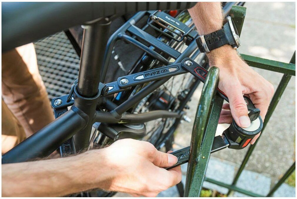 The K-Traz F16 uses U-Locking security features, coupled with the practicality of a wind-up cable. It has a high level of tensile and torsional strength, making it highly resistant against theft and drilling. It features the Z-Safe locking mechanism which is a powerful double locking system, making the lock highly resistant against impacts and twists.