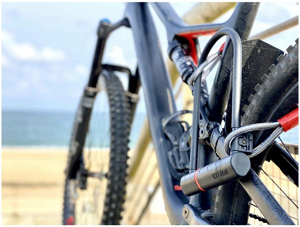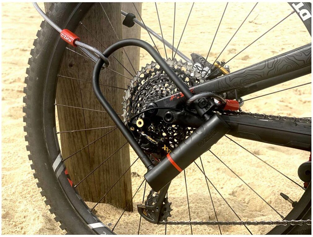 A tough and secure shackle lock made from hardened steel and a tough cable lock wrapped in a vinyl cable cover to prevent wear against the frame.